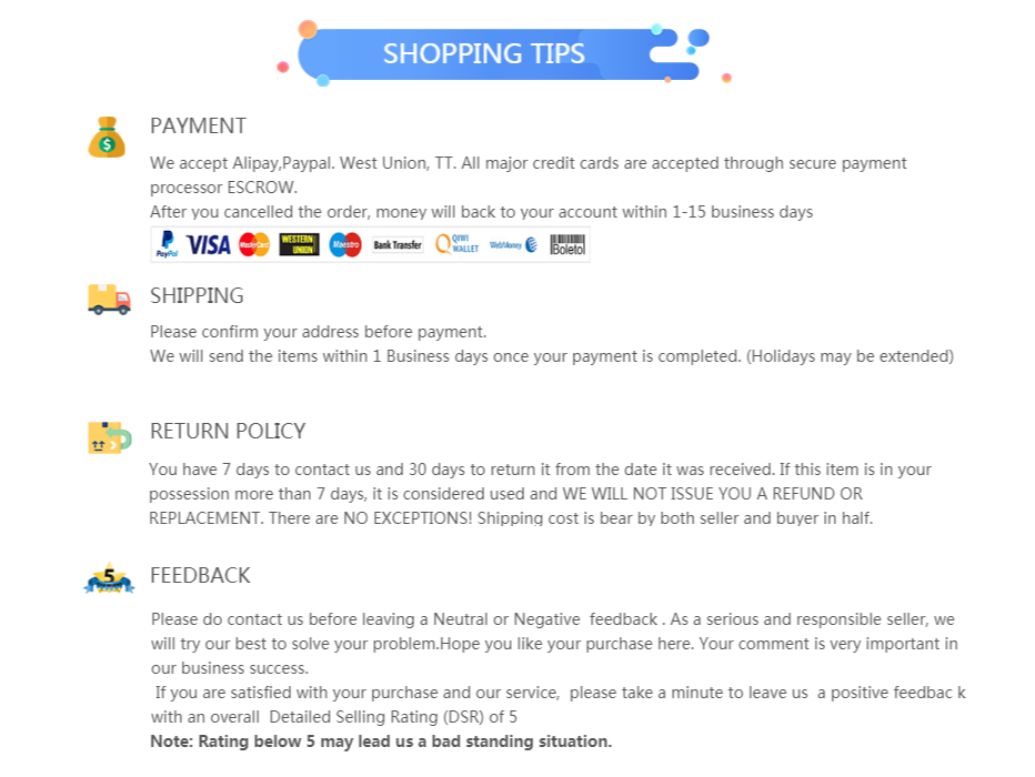 2. Defective items MUST BE reported and returned within the warranty period (and in the original packaging, if possible). You must tell us what the defect is and give us your order number. WE DO NOT REPAIR OR REPLACE ITEMS WITH AN EXPIRED WARRANTY. You agree to all of the above-listed policies upon ordering on Aliexpress!