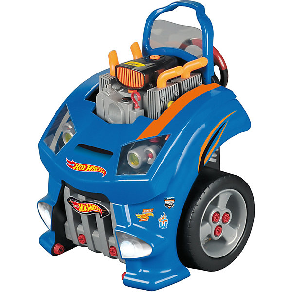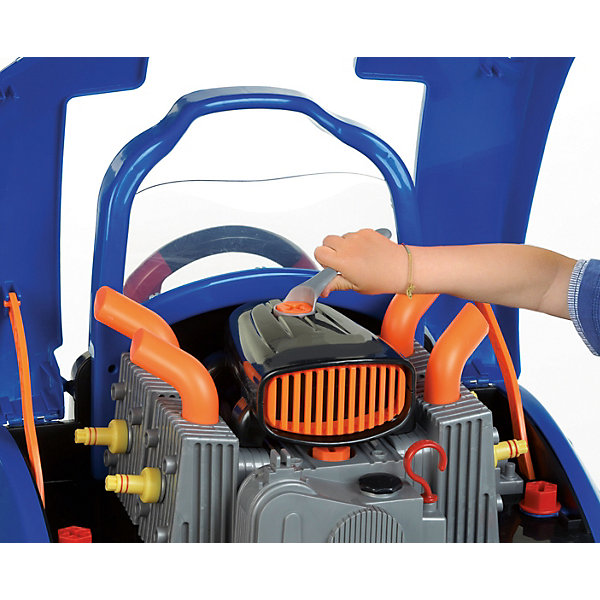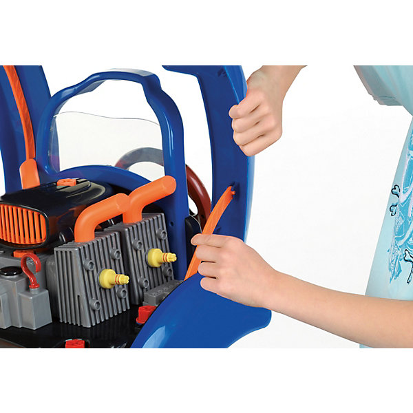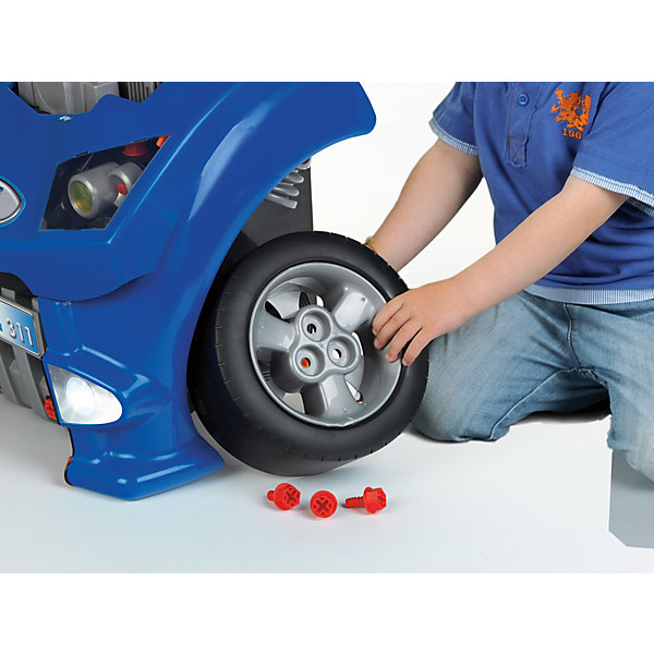 Набор создан в виде части автомашины. На самом деле это практически полноценная станция по ремонту автомобилей. Здесь можно проверить уровень масла, поменять фильтр, колеса или тормозные диски, провести осмотр двигателя, отрегулировать свет фар. На приборной панели поворачивается ключ и включается свет. Кроме этого, к автоцентру можно присоединить горку-трек для машинок. Центр оснащен звуковыми и световыми эффектами.