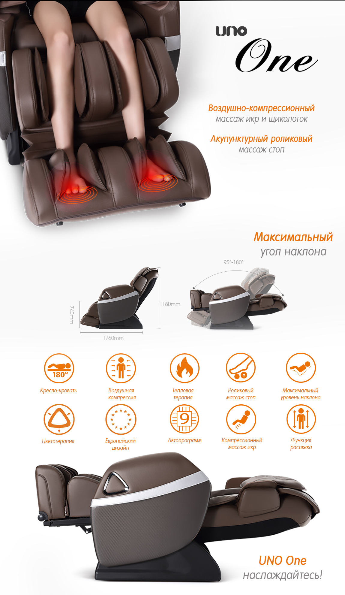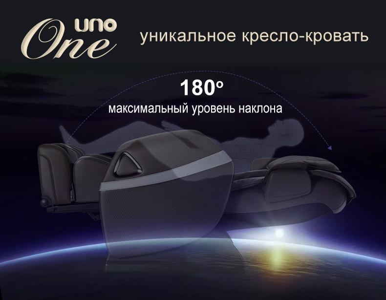 Официальный поставщик UNO в России Прямая поставка, гарантия 3 года, дальнейшее сервисное обслуживание Получите уникальную скидку при предзаказе до конца ноября Новое массажное кресло-кровать расширенным функционалом Кресло-кровать полностью раскладывается под углом в 180 градусов Объемный воздушно-компрессионный массаж Тепловая терапия в области поясницы Воздушно-компрессионный массаж икр Роликовый массаж стоп 10 автопрограмм Специальная программа "Растяжка"
