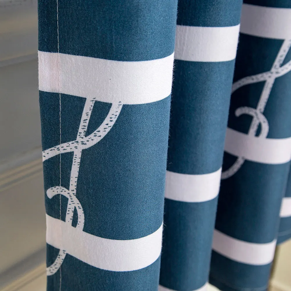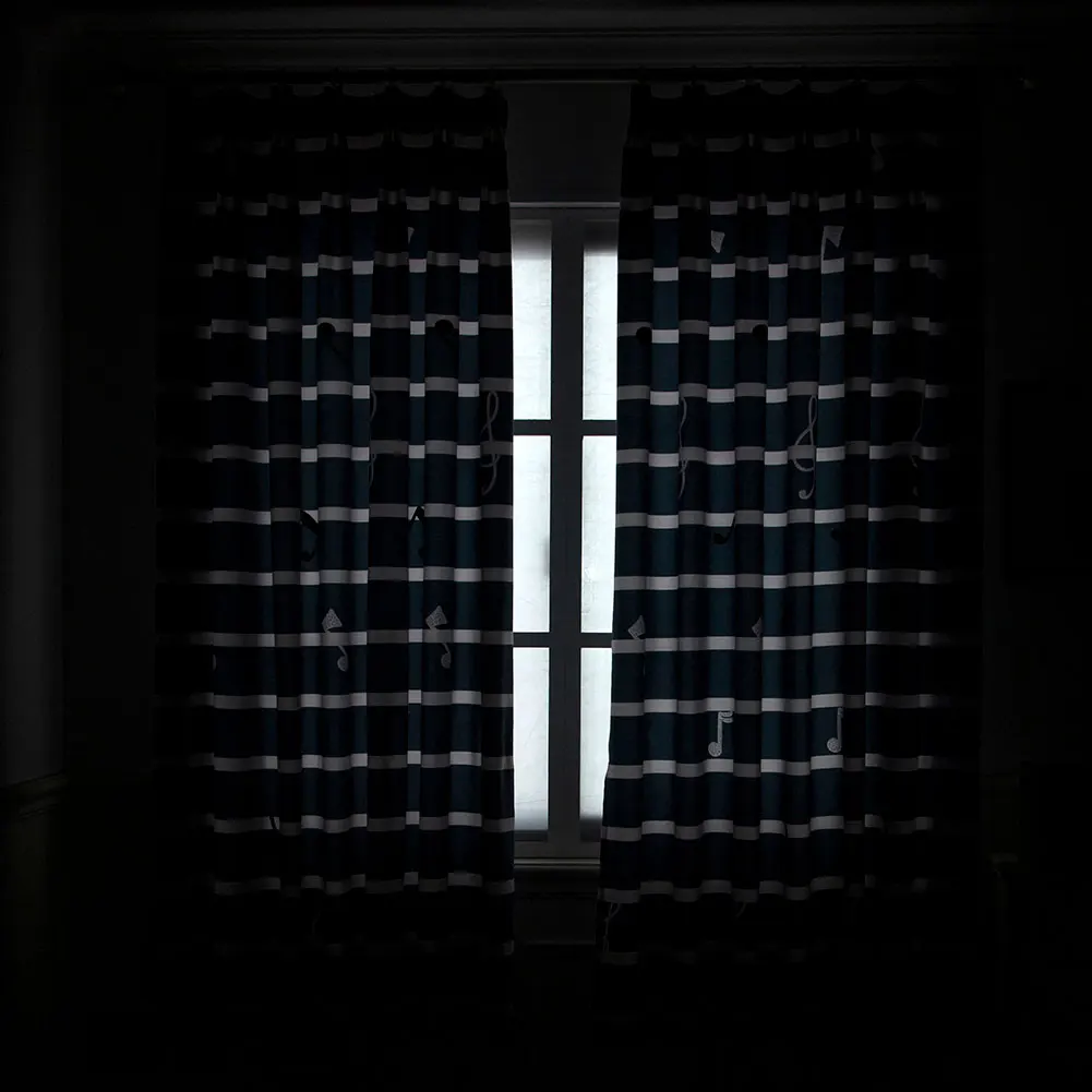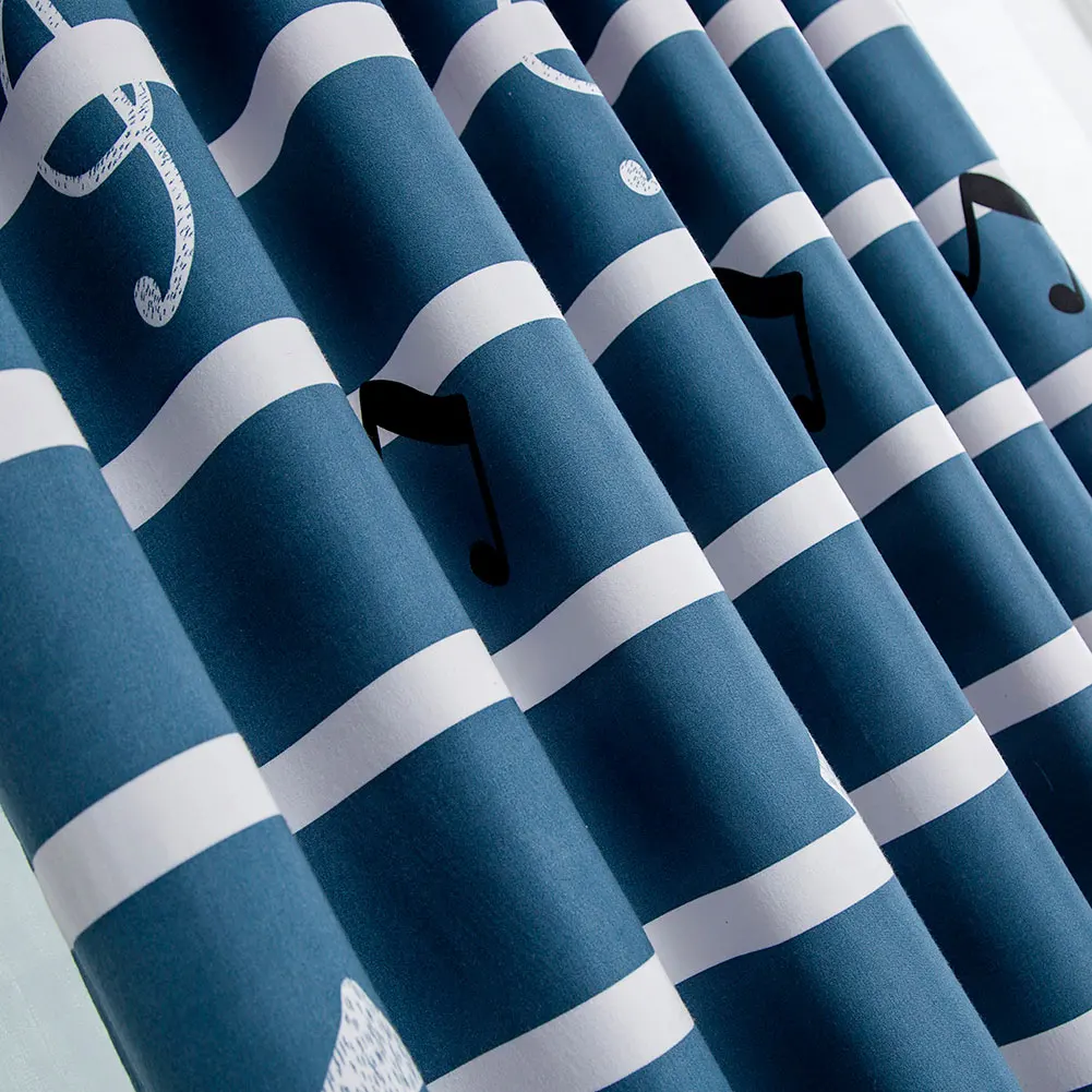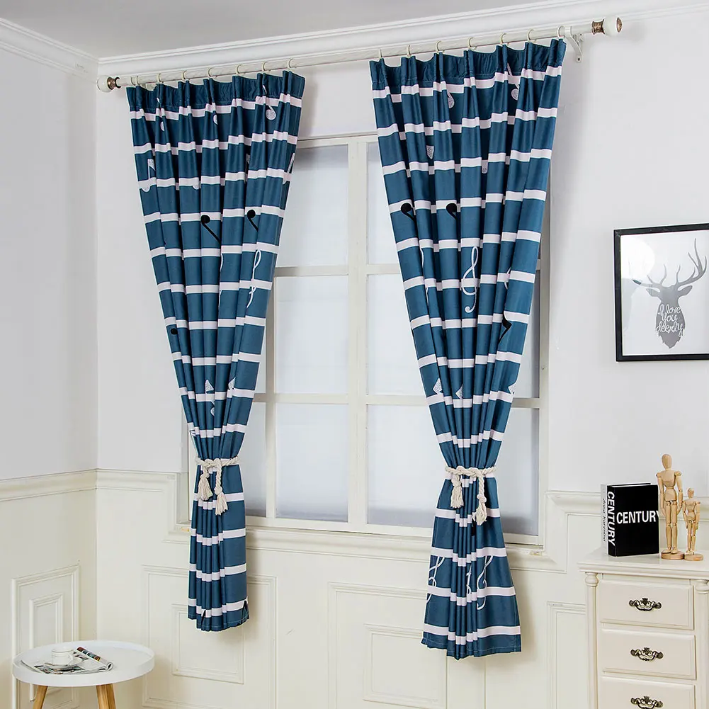 Элегантная и свежая занавеска в полоску и с узором в виде нот.