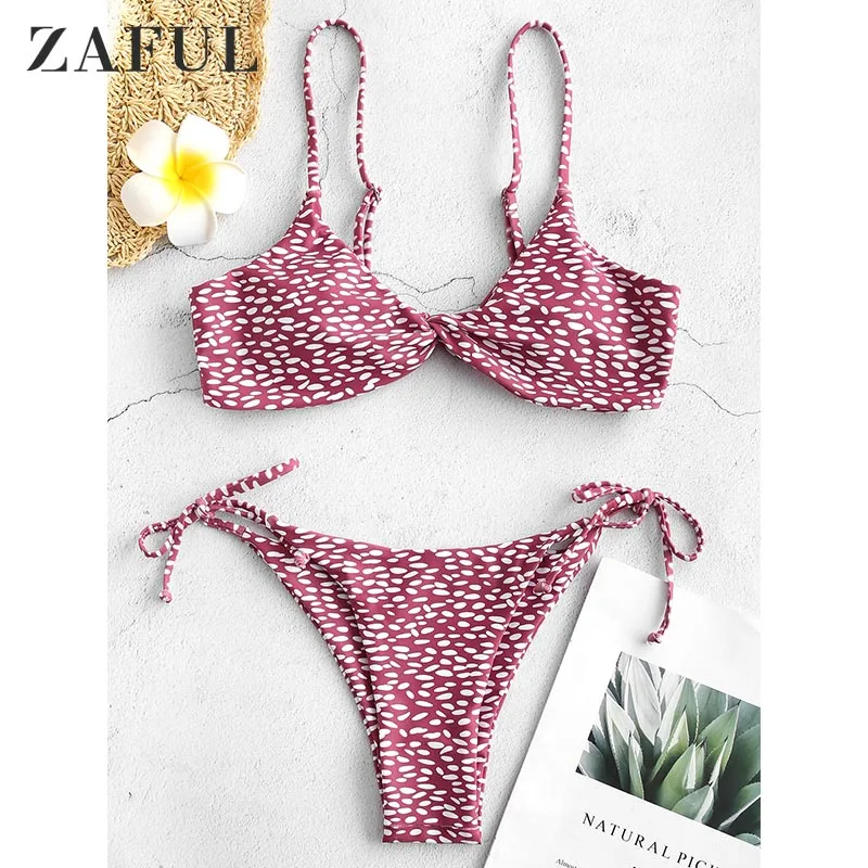 В пикантном, но симпатичном стиле этот комплект бикини с пятнистым рисунком, привлекающий внимание перекручивающий дизайн спереди со съемной чашкой с мягкой подкладкой. Плавки-стринги с завязками по бокам с деталями в форме стрингов. Это будет лучший выбор для вас.