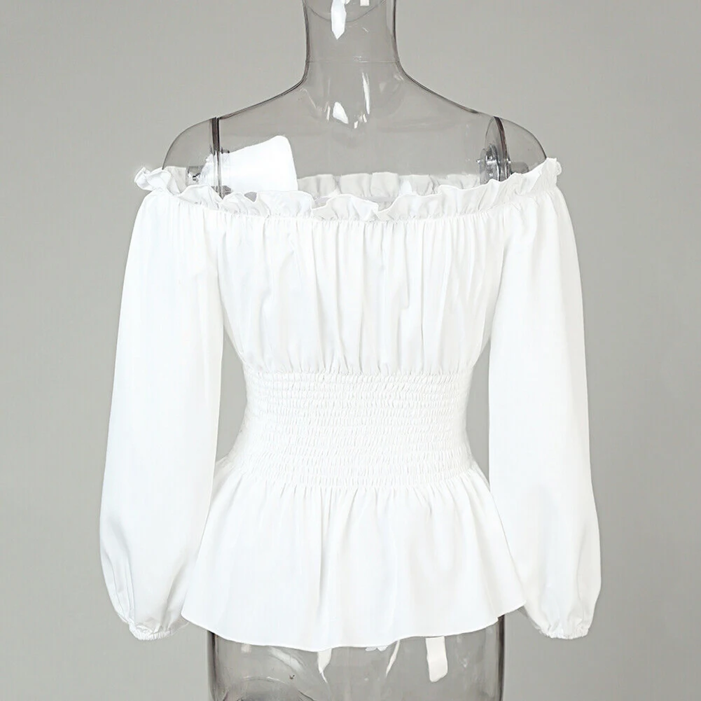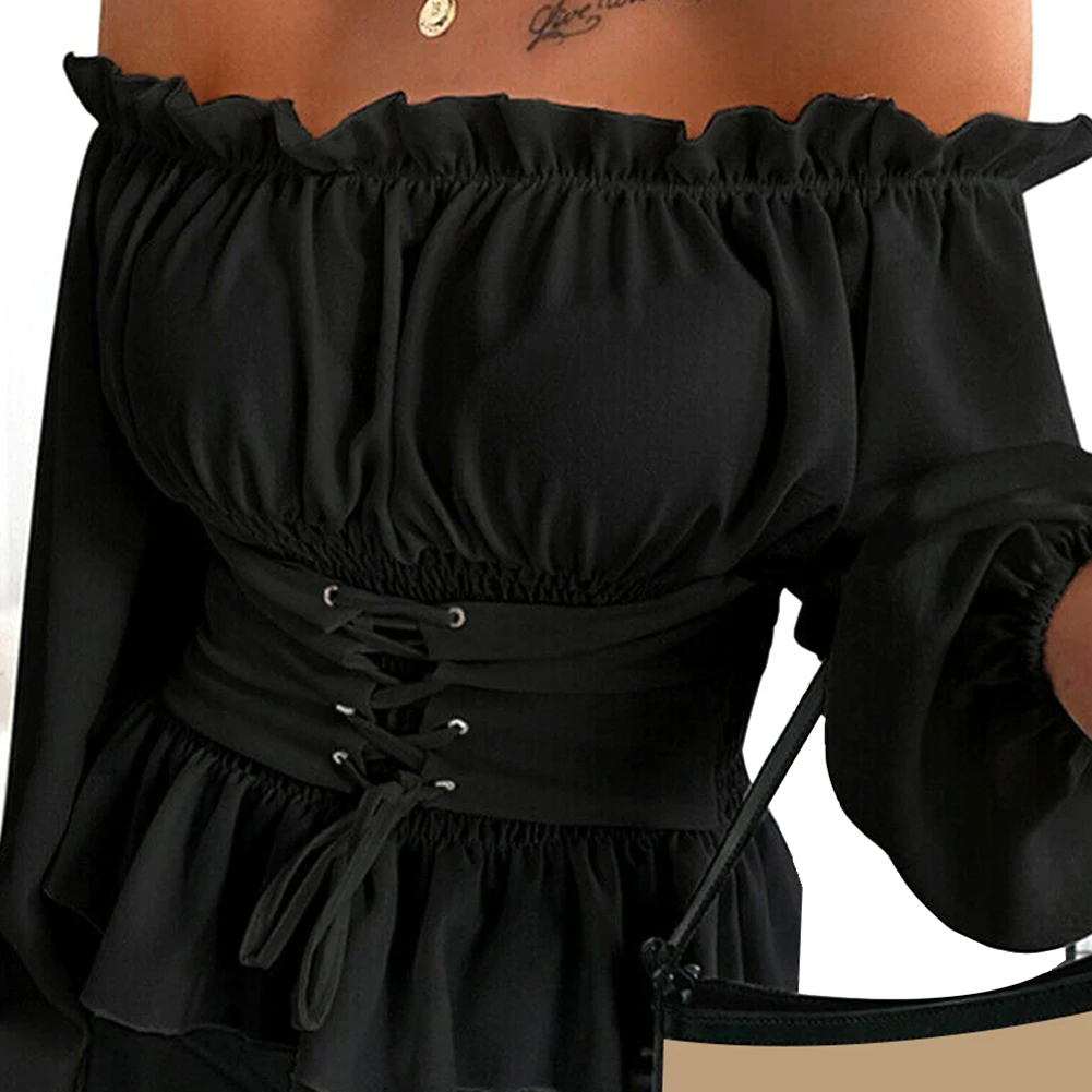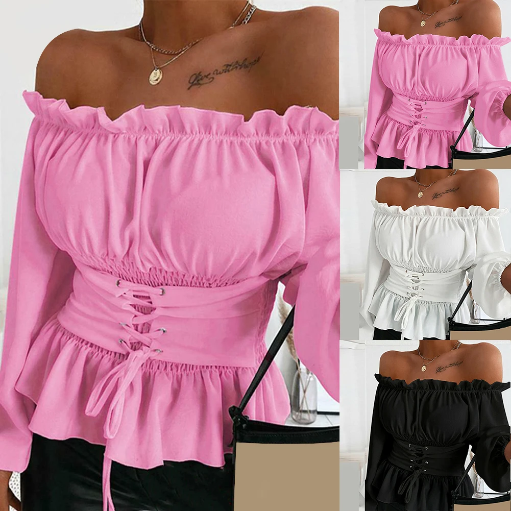 Женская Осенняя Повседневная однотонная блузка с длинным рукавом и оборками на Подоле с открытыми плечами