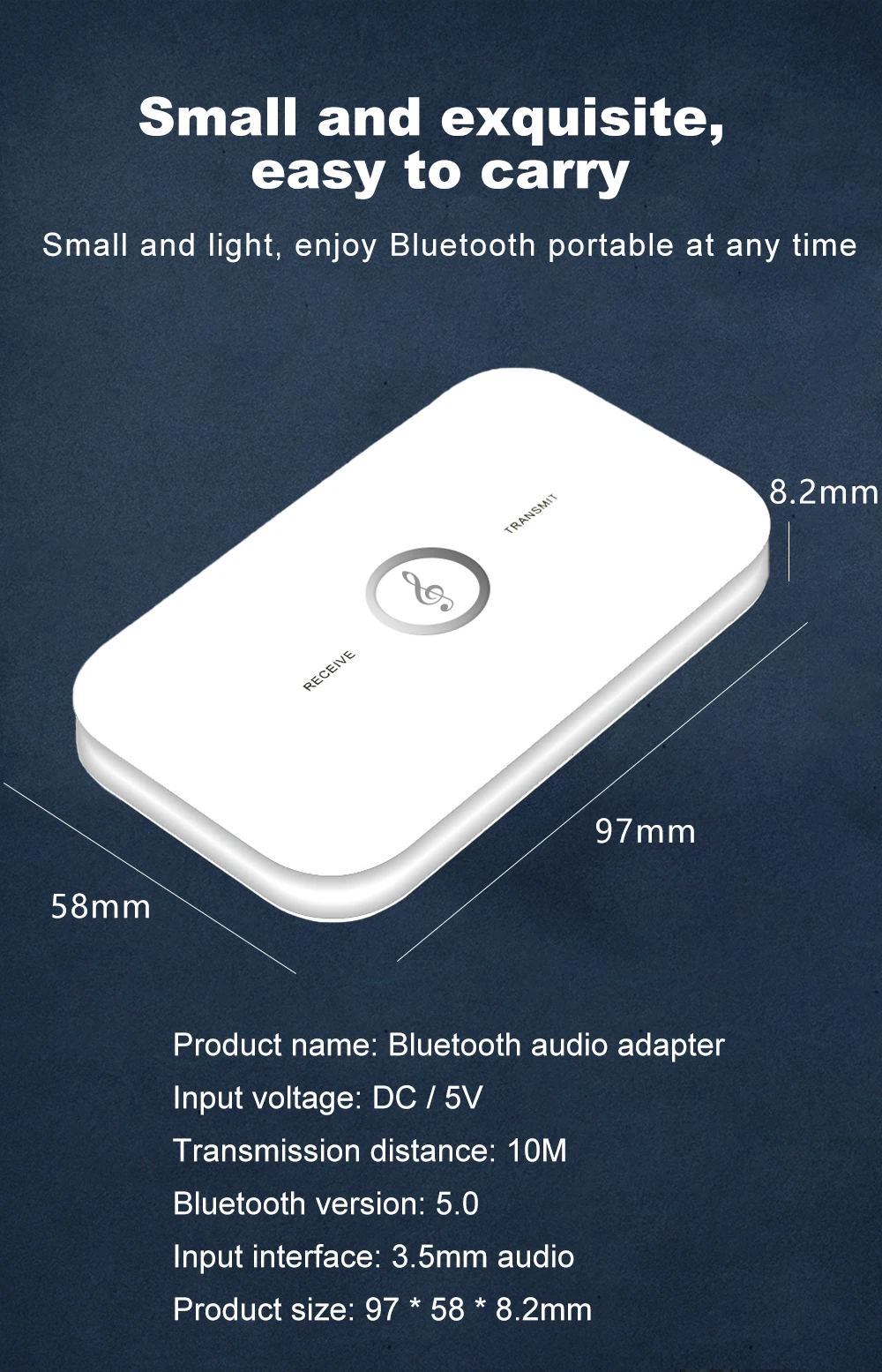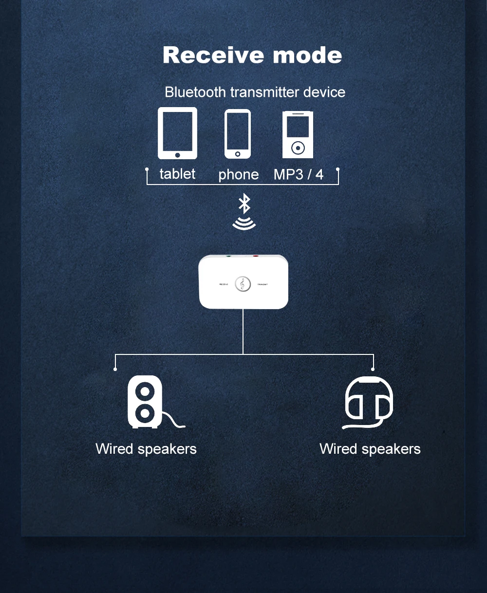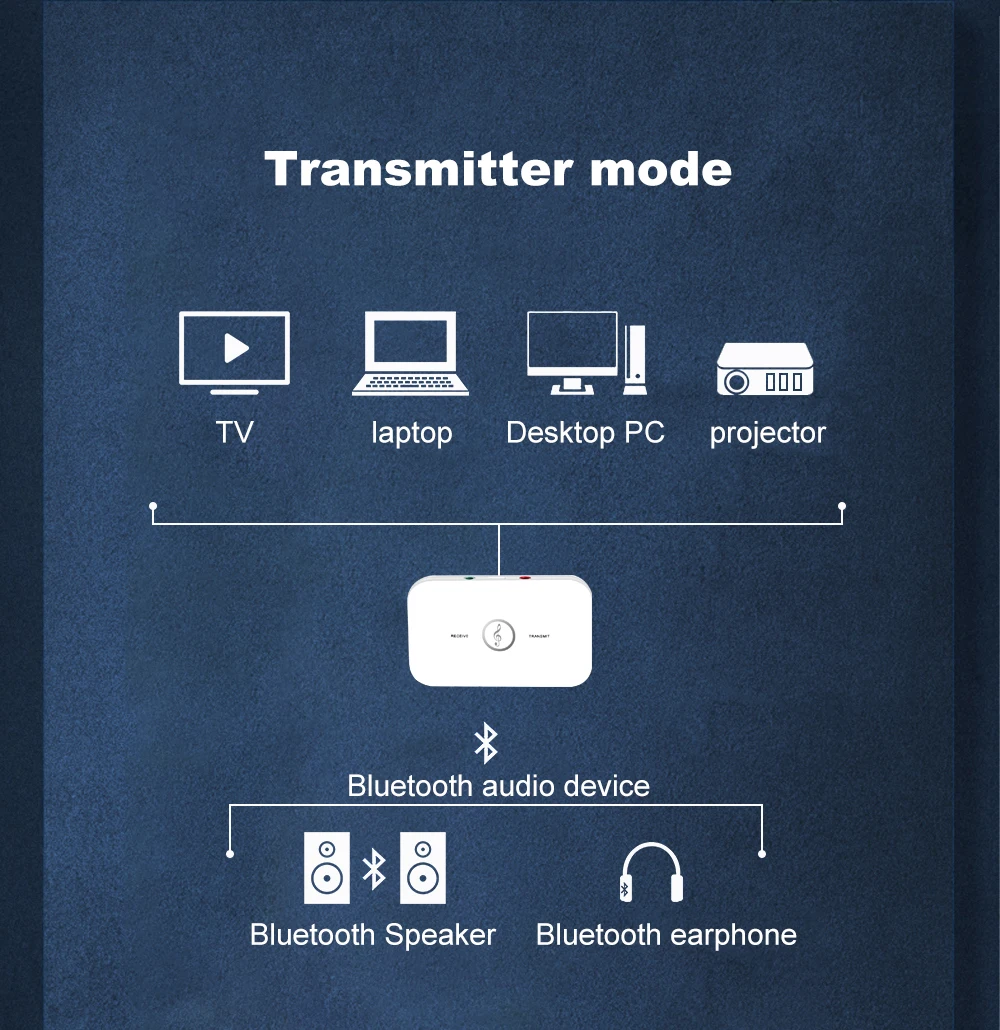 2 в 1 bluetooth-передатчик и приемник, как bluetooth-аудио передатчик, B6 специально разработан для аудиоустройств (например, MP3, MP4, TV и PC и т. д.) без функции Bluetooth. Bluetooth передатчик можно подключать к аудиоустройствам без функции Bluetooth с помощью прилагаемого 3,5 мм аудио разъем изменение этих аудио-устройств в аудио-устройства с поддержкой Bluetooth, И позволяет работать с bluetooth-гарнитурой и динамиком; В качестве bluetooth-аудиоприемника B6 специально разработан для автомобильной стереосистемы s и домашней аудиосистемы. Он может изменить традиционные автомобильные стереосистемы и домашние аудиосистемы на bluetooth-совместимые и легко сопрягать с bluetooth-совместимыми смартфонами, ноутбуками, планшетами и т. д. С помощью этого продукта вы можете наслаждаться музыкой с вашего телефона, ноутбука, планшета без хлопот кабелей.