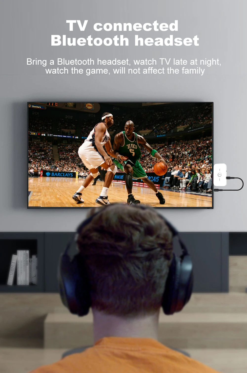 4. Беспроводная функция: хотите смотреть футбол/Бейсбол/бокс/Гольф/НБА игра поздно ночью, не разбудив кого-либо? Это отличный выбор для вас. Функция bluetooth-передатчика по беспроводной сети передает аудио в bluetooth-колонки или наушники с вашего телевизора или более старых мультимедийных устройств, таких как портативные CD-плееры, которые не имеют встроенного Bluetooth.