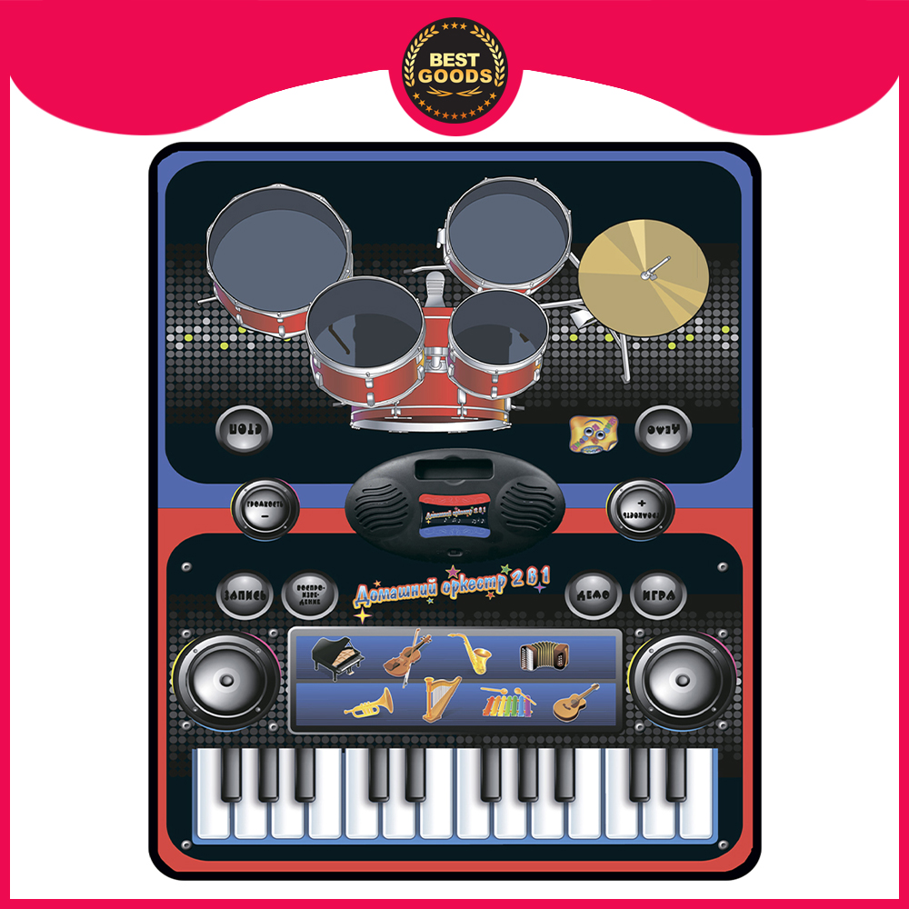 "Со звуковым ковриком "Домашний оркестр 2 в 1" ребенок может попробовать себя в роли пианиста, скрипача, гитариста, настоящего барабанщика, играя на ударной установке палочками с резиновыми головками, и не только, ведь развивающий коврик позволяет воспроизводить звуки 8 музыкальных инструментов!