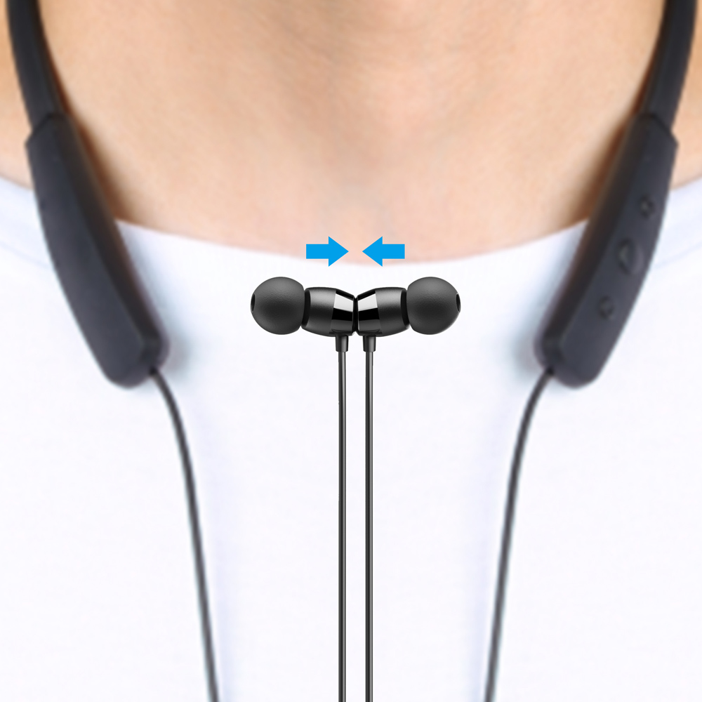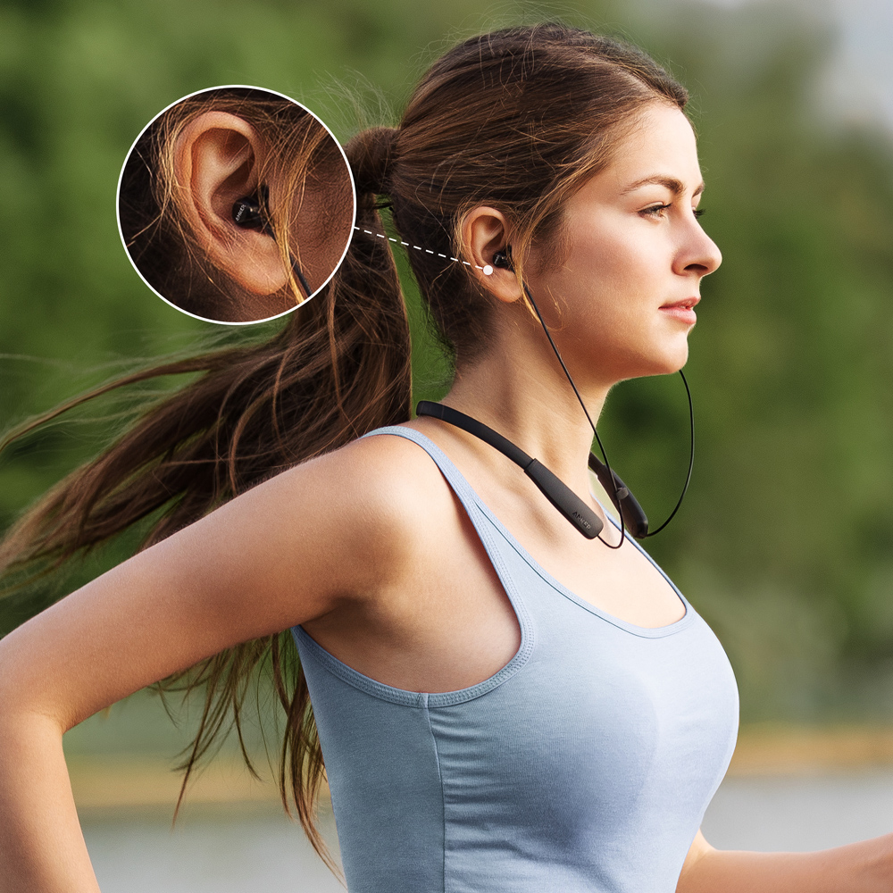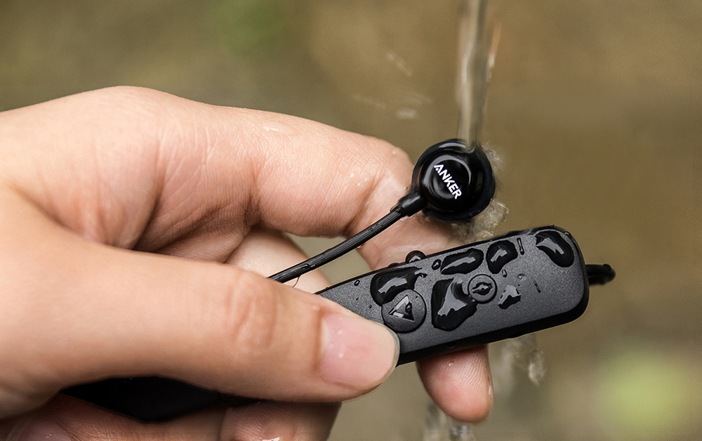 Wireless headphones with microphone Anker soundbuds Lite have a convenient neck cord and a three-button remote with a microphone. The design of the model is dustproof-waterproof and can be used for sports training. For maximum wearing comfort, when the headset is not used, the reverse sides of the emitters can be fastened through built-in magnets.