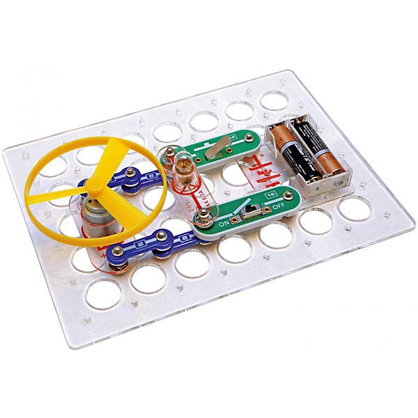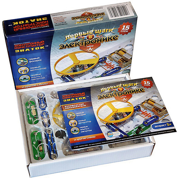 Набор содержит подробное описание 15 электронных схем, теоретические обьясния, аопросы и задания. Ребёнок может собрать свой первый фонарик, вентилятор, опробывать звуковые схемы, провести эксперименты с магнитом и многое другое.