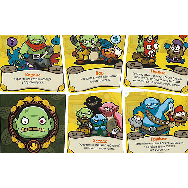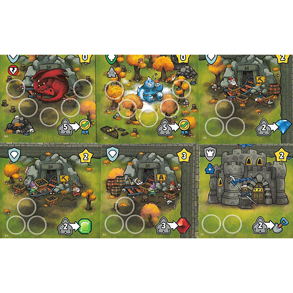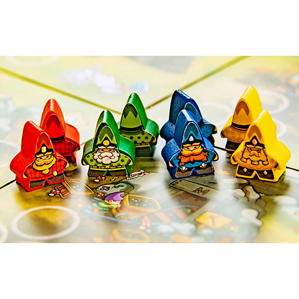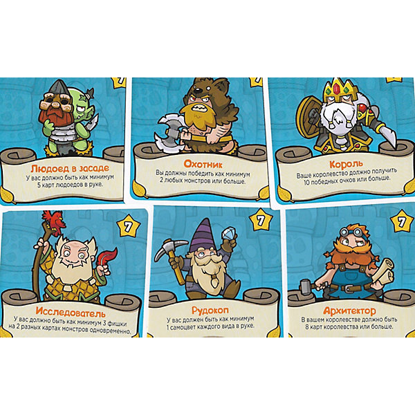• комплектация: 36 карт королевства, 34 карты самоцветов, 7 карт секретных целей, 10 карт торговых целей, 13 карт людоедов, 28 фигурок гномов 4 цветов, наклейки на гномов, правила игры с иллюстрациями и примерами
