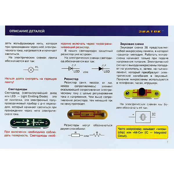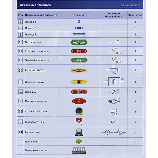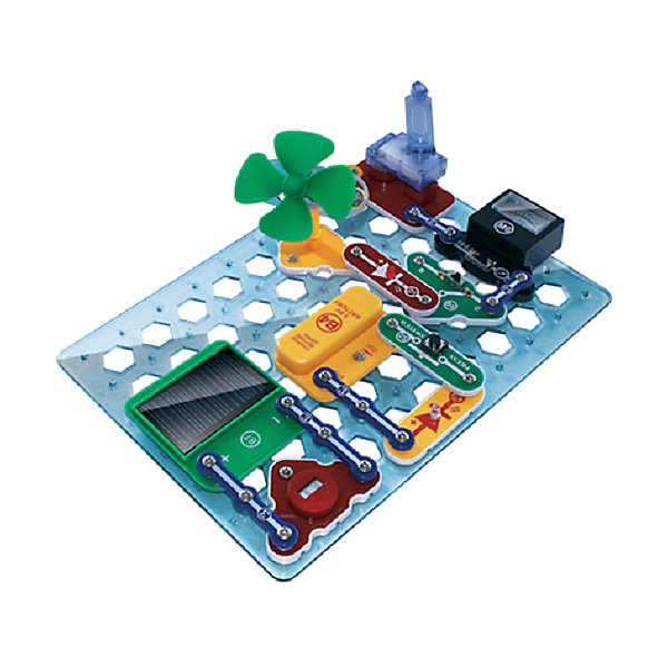 • в комплекте: 1 монтажная плата, 1 пропеллер, 1 мультиметр, 1 генератор ручной, 1 солнечная батарея, 1 электродвигатель, 1 лампа 6V, 3 звуковых схем, 1 резистор, 2 светодиода, 1 включатель, 12 соединительных элементов;