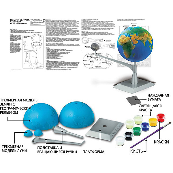 • в комплекте: трёхмерная модель Земли с географическим рельефом, трёхмерная модель Луны, подставка и вращающиеся ручки, палитра с обычной и светящейся красками, кисточка, наждачная бумага, инструкция по сборке и раскрашиванию с интересными фактами и идеями для игры