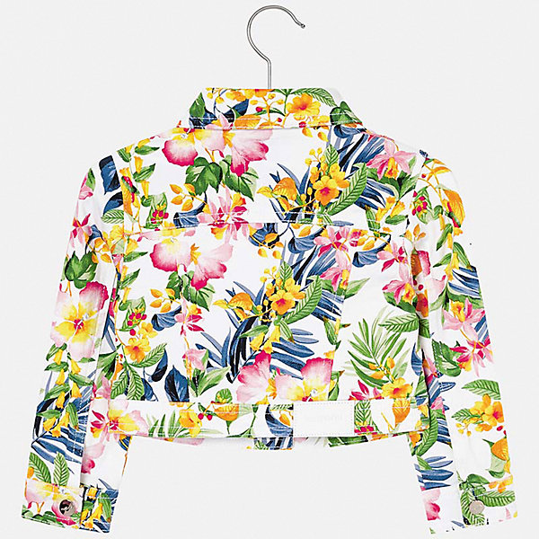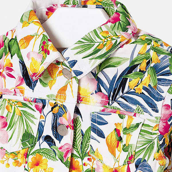 Ветровка имеет укороченный крой. Длинные рукава фиксируются кнопками и не перекручиваются при носке. Классический отложной воротник. Ткань с разнообразным цветочным рисунком. Изделие не стесняет движений.