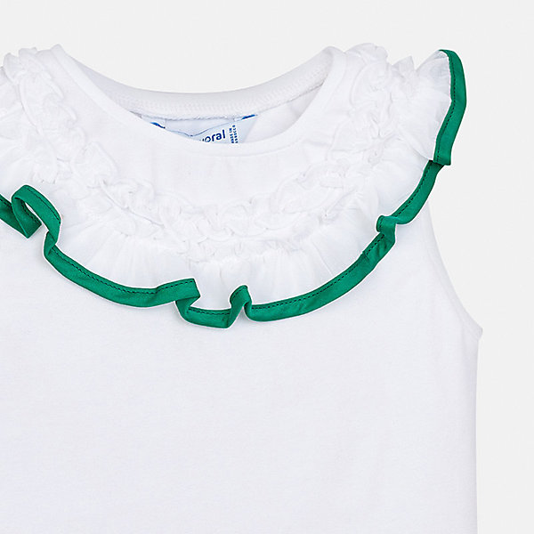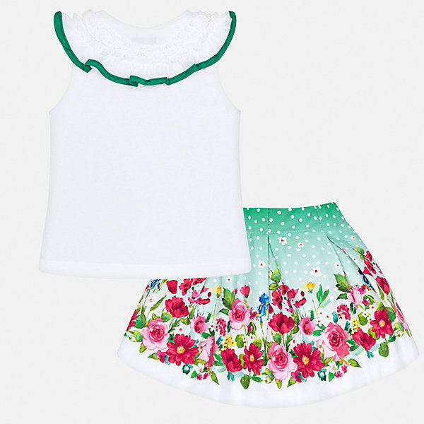 Футболка прямого кроя, без рукавов. Округлая горловина. На груди украшена оборками с контрастной окантовкой. Юбка в складку изготовлена из дышащего материала. Комфортно облегает в талии.