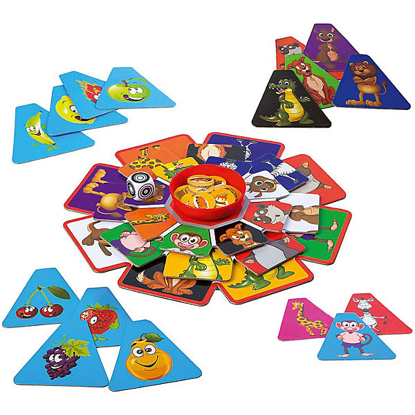 • в комплекте: 5 игровых полей, 1 игральная кость, 13 медалей, 8 карточек с животными, 8 карточек с фруктами, 2 базы для игрового поля, 4 пластиковые прокладки