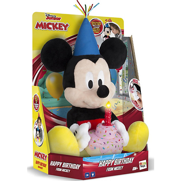 У Микки Мауса день рождения. Он надел на голову синий колпак, а в руках держит кусочек тортика со свечкой, которую можно задуть, она погаснет и зазвучат аплодисменты. А нажав на ручку мышонок начнёт петь песенку. Изготовлена из мягкого и приятного на ощупь материала, совершенно безопасного для ребёнка.