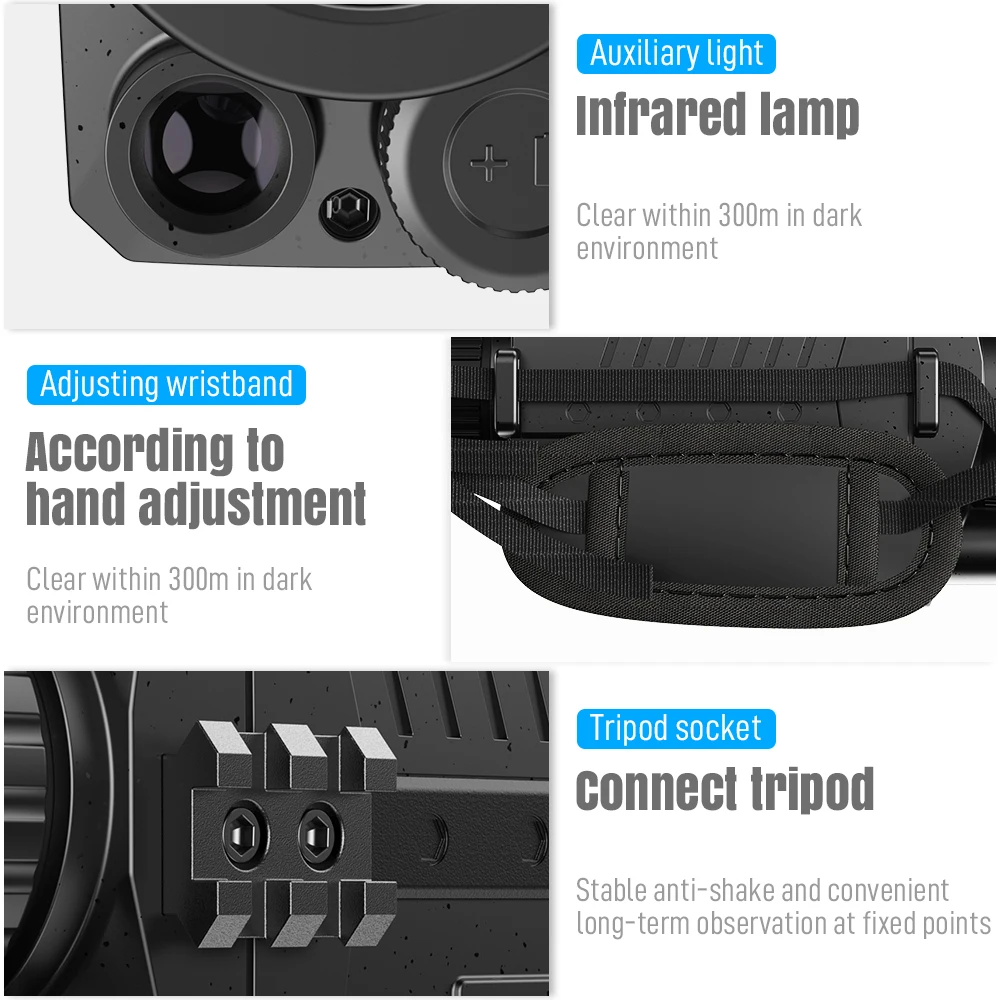 * С usb-портом и портом передачи видео. Быстрая и простая передача данных с помощью usb-кабеля, просмотр изображений и видео на мониторе с отключением видео и подзарядкой аккумулятора с помощью разъема постоянного тока. Монокуляр может использоваться для съемки фотографий или видеосъемки днем или ночью.
