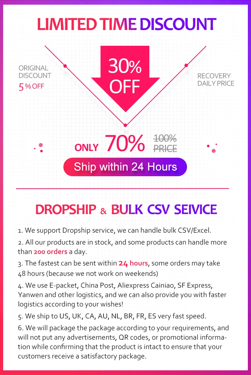 FAQ В: есть ли скидка на крупные заказы? О: если вы разместите у нас крупный заказ в течение определенного периода времени, мы отправим товар вместе и предоставим Вам скидку. В: Поддерживаете ли вы другие варианты доставки? О: Да, мы предоставляем Почта Китая обычных малых пакетов Plus, Cainiao Super Economy, ePacket, стандартную доставку AliExpress и заказную авиапочту Почта Китая В: все ли фотографии настоящие? О: Конечно, все наши фотографии на 100% сделаны нашими фотографами В: Поддерживаете ли вы прямые поставки? О: Да, мы поддерживаем прямую доставку. Вам нужно только подтвердить информацию В: почему доставка такая медленная? О: на самом деле, это не так быстро, как DHL fedex, потому что все наши продукты имеют низкую маржу и бесплатную доставку для большинства стран, что является потерей для некоторых стран, если честно, но я считаю, что логистика не медленная и может отслеживать, куда идет информация. Отгрузка 1. После оплаты, из-за ситуации с запасами и разницы во времени, мы выберем отправку ваших товаров с нашего первого доступного склада для быстрой доставки, мы тщательно подготовим товар для вас в течение 1-5 дней. Обычно время доставки составляет 5-60 дней и даже больше для судов из отдаленных или слаборазвитых стран. 2. Мы отправляем только на подтвержденный адрес ordera. Ваш адрес заказа должен совпадать с адресом доставки. 3. Время доставки услуги должно быть предоставлено перевозчиком, за исключением выходных и праздничных дней. Время доставки может варьироваться, особенно во время праздников. 4. Информация об отслеживании будет предоставлена в течение 2-5 дней после отправки (информация об отслеживании в некоторых случаях не предоставляется бесплатно). Если вы все еще не получили товар, когда срок доставки подходит к концу, пожалуйста, свяжитесь с нами, чтобы продлить для Вас дату доставки. 5. Если вы не получили товар в течение 60 дней после оплаты, пожалуйста, свяжитесь с нами. Мы Отследим доставку и свяжемся с вами в кратчайшие сроки. Наша цель – удовлетворение клиентов! Возмещение 1. При получении товара, если вы обнаружили какую-либо проблему с товаром, пожалуйста, немедленно свяжитесь с нами и предоставьте нам достаточные доказательства. (Совет: при открытии посылка запишите незапечатанное видео.) Если товар Действительно поврежден, сделайте фото и отправьте его на нашу электронную почту или онлайн-чат, чтобы связаться с нами. Мы предоставим Вам решения или компенсацию. 2. У вас есть 7 дней, чтобы связаться с нами и вернуть товар через 15 дней после получения. Если у вас есть товар более 7 дней, вы рассмотрите возможность его использования, и мы не вернем Вам деньги или заменим его. 3. Все возвращаемые товары должны быть в оригинапосылка вке, и вы должны предоставить нам номер отслеживания доставки, конкретную причину возврата и идентификатор вашего заказа. 4. После получения первоначального состояния и упаковки возвращаемого товара со всеми компонентами и аксессуарами, мы вернем вам полную сумму покупки. 5. Если товар прибудет к вам, а вы его не заберете, он будет возвращен нам. После получения товара, мы вернем или повторно отправим его вам по запросу (вы будете нести ответственность за возврат и почтовый сбор). Отзывы Отзывы 1. Если вы довольны нашими товарами, Мы будем признательны за ваш отзыв в пять звезд. Мы поставим вам такой же отзыв с 5 звездами. Но есл