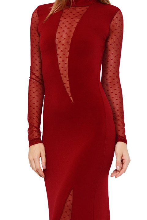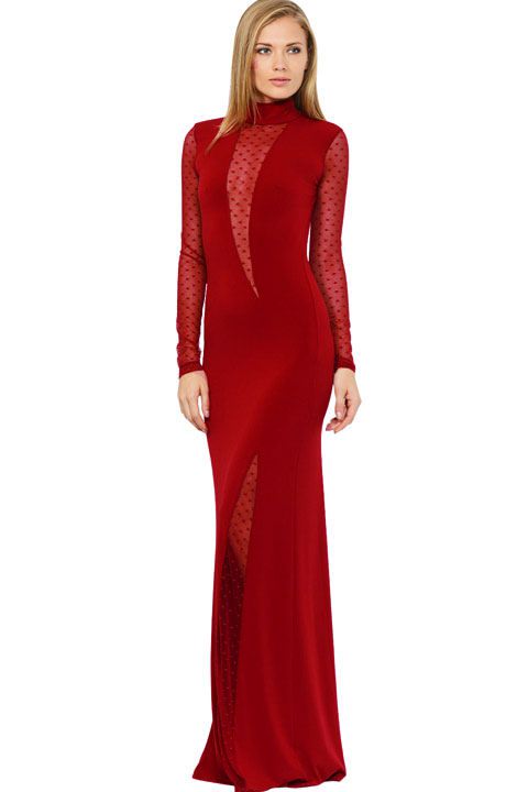 Изумительное бордовое платье в пол! Модель приталенного кроя, с воротником-стоечкой. Платье выполнено из двух видов ткани: основная –эластичный полиэстер, и ткань сетка – которой декорированы подол, рукава и соблазнительное декольте.
