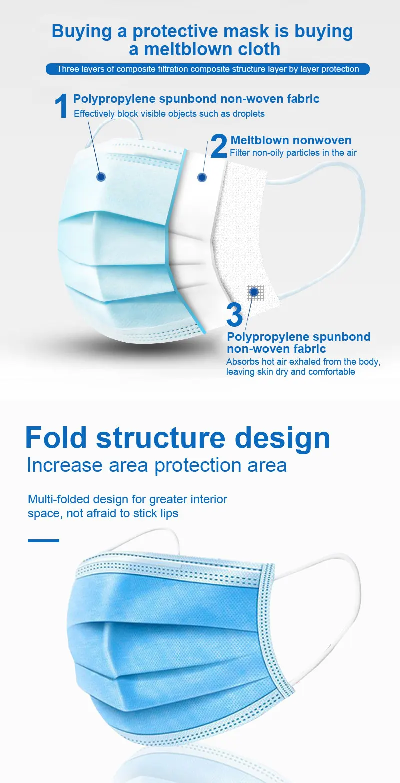 Одноразовая маска гражданского 3-х слойные ежедневная маска Параметры продукта: Материал: трехслойный нетканый материал Подходящий сезон: Весна, Осень, Зима, Лето Цвет: синий Стиль маски: Тип уха Размер: один размер Особенности продукта: 1. Новая ткань PP Нетканая ткань, мягкая и чистая, удобная и дышащая 2. Процесс бесшовной вязки 3. Три раза дизайн, больше дышащего пространства на лице 4. Пластиковая полоска для носа, алюминиево-пластиковая полоска для носа, 5. Многослойная защита для вашего дыхательного здоровья Как носить маску: 1. Закройте рот и нос и Повесьте два боковых ремня на уши 2. Фиксация моста носа в соответствии с формой носа предотвращает загрязнения воздуха от входа. 3. Пожалуйста, потяните маску к нижней челюсти, чтобы немедленно предоставить трехмерное дышащее пространство. Пожалуйста, обратите внимание, что указанный Товар производится и распространяется за рубежом и в соответствии с законодательством страны происхождения