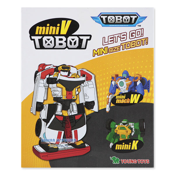 Мини V – суперминивэн!Персонаж популярного мультфильма «Тобот» теперь и в мини-версии. Это две игрушки в одной, которые радуют не только фаната. Теперь в вашем распоряжении есть и робот в доспехах с ногами и руками на шарнирах, и маневренный фургон на 4 колёсах. Научитесь быстро трансформировать тобота в машину и обратно.