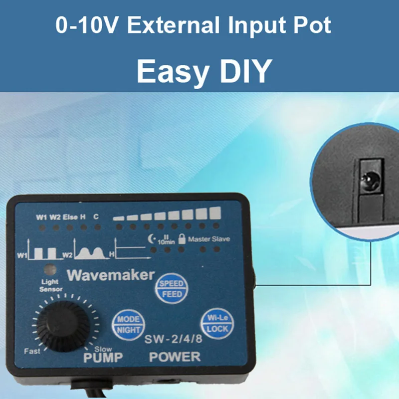 W1: волновой режим, удаляющий ручку, необходим при работе с этим режимом, чтобы настроить волновые узоры между одним или несколькими насосами одновременно. Поскольку объем воды в баке отличается от объема бака, период волн необходимо регулировать, переключая ручку. Самая большая волна, когда длина волны поворачивается так же, как длина резервуара; Увеличьте длину волны, переключая ручку по часовой стрелке и уменьшая ее против часовой стрелки. Советы: Вы должны Переключить ручку постепенно и заметить волновой узор в определенный период после каждой регулировки. Нажмите «скорость/подача» для регулировки скорости потока.