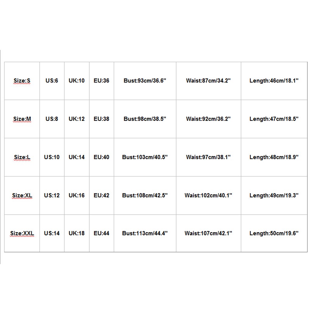 Размер США Великобритания ЕС Бюст Талия Длина S 6 10 36 93 см/36,6" 87 см/34,2" 46 см/18,1" М 8 12 38 98 см/38,5" 92 см/36,2" 47 см/18,5" L 10 14 40 103 см/40,5" 97 см/38,1" 48 см/18,9" XL 12 16 42 108 см/42,5" 102 см/40,1" 49 см/19,3" XXL 14 18 44 113 см/44,4" 107 см/42,1" 50 см/19,6"