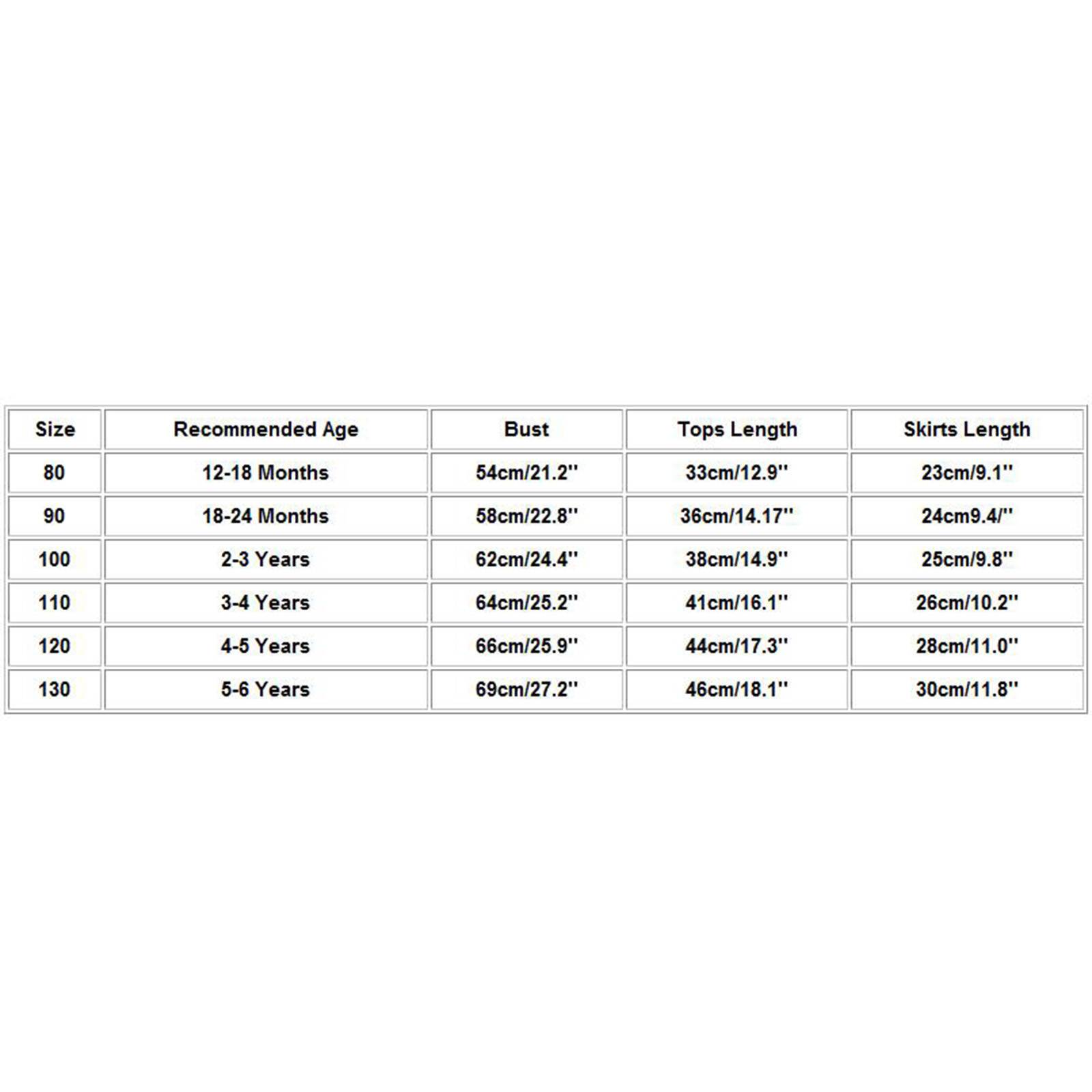 Размеры Рекомендуемый возраст Бюст Длина топа Длина юбки 80 12-18 месяцев 54 см/21,2'' 33 см/12,9'' 23 см/9,1'' 90 18-24 месяцев 58 см/22,8'' 36 см/14,17'' 24 см9. 4/'' 100 От 2 до 3 лет 62 см/24,4'' 38 см/14,9'' 25 см/9,8'' 110 От 3 до 4 лет 64 см/25,2'' 41 см/16,1'' 26 см/10,2'' 120 От 4 до 5 лет 66 см/25,9'' 44 см/17,3'' 28 см/11,0'' 130 От 5 до 6 лет 69 см/27,2'' 46 см/18,1'' 30 см/11,8''