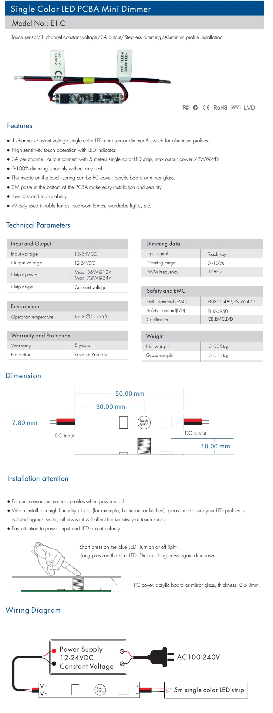 ● 3 А на канал, выход соединяется с 5 метровыми одноцветными светодиодный полосками, максимальная выходная мощность 72 Вт @ 24 В.