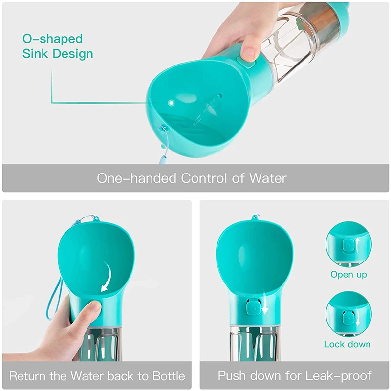 【Perfect бутылка с водой для домашних животных Bottle】Эта бутылка для собак позволяет вам легко брать щенка или других домашних животных на прогулки, в путешествие или в поход. Под контейнером для воды имеется контейнер для корма для собак. Он может удовлетворить различные потребности собак. О-образный желоб для питья больше подходит для всех видов собак, а также может предотвратить проливание воды.
