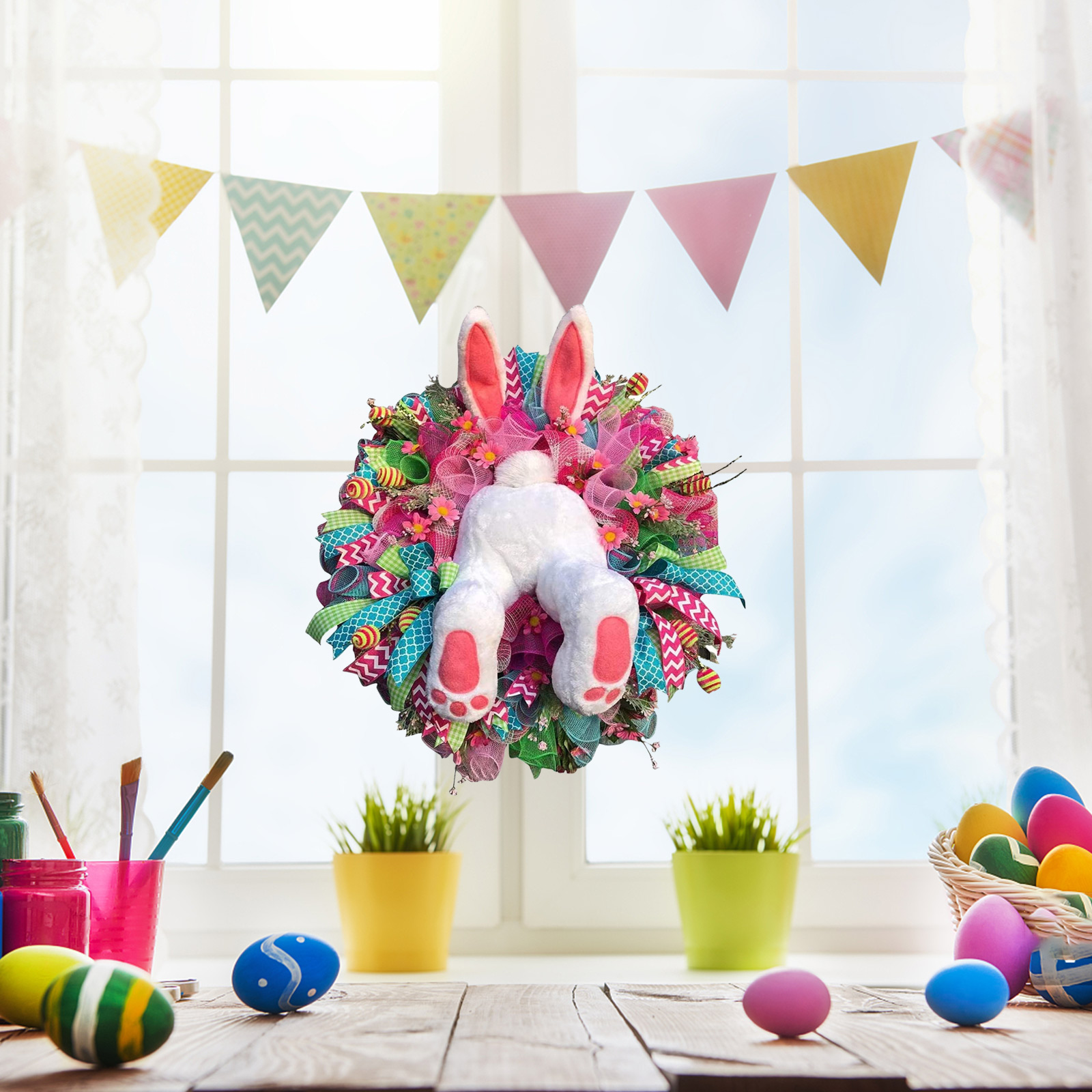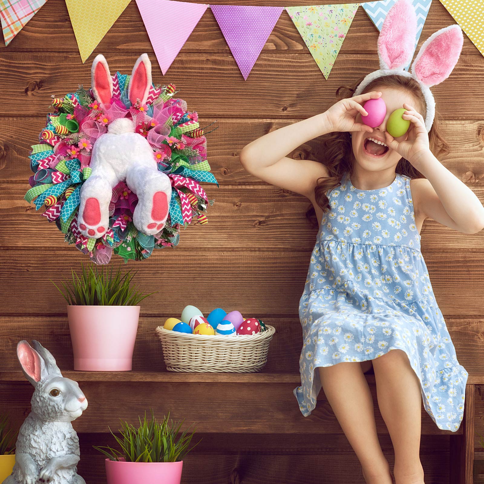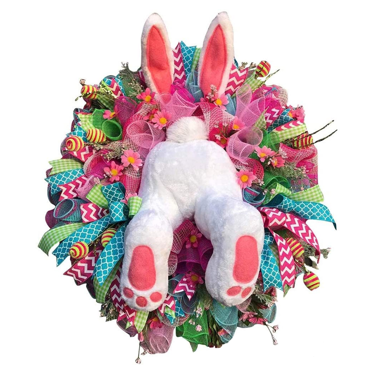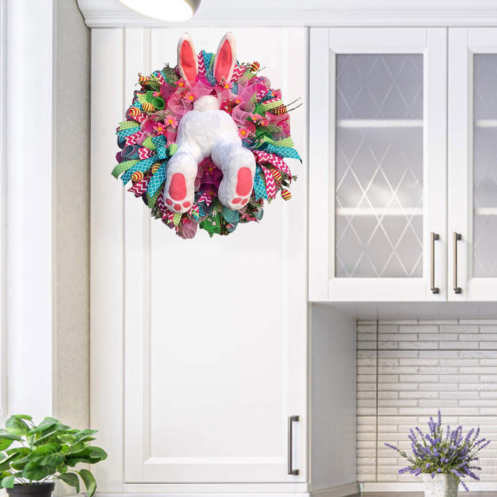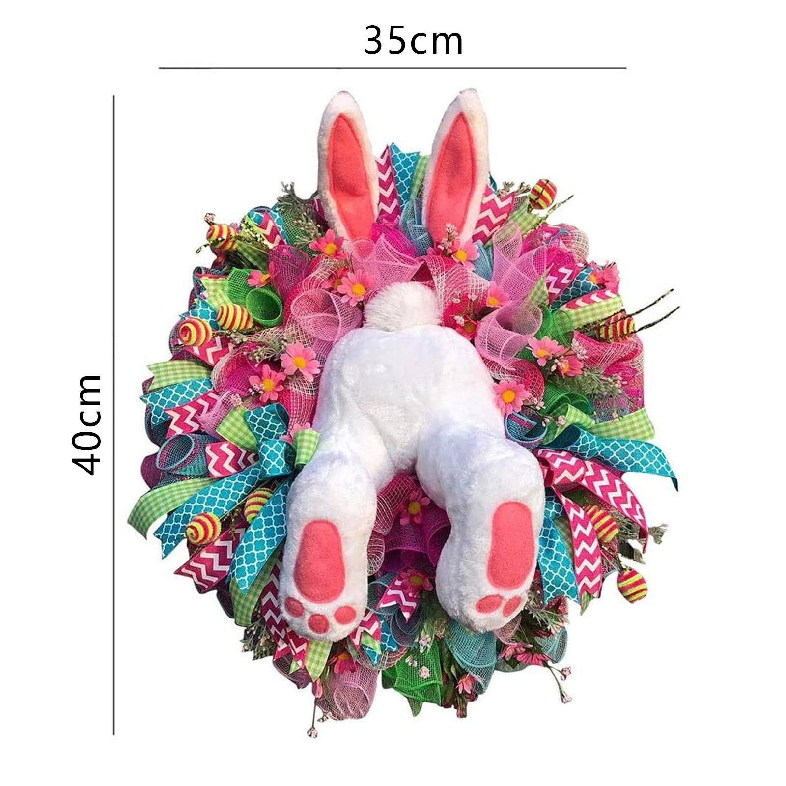 Уникальный дизайн:Этот Пасхальный венок кролика с милым плюшевым кроликом и красочными искусственными цветами, полон весеннего ощущения, идеальное украшение для вечеринок и садов.