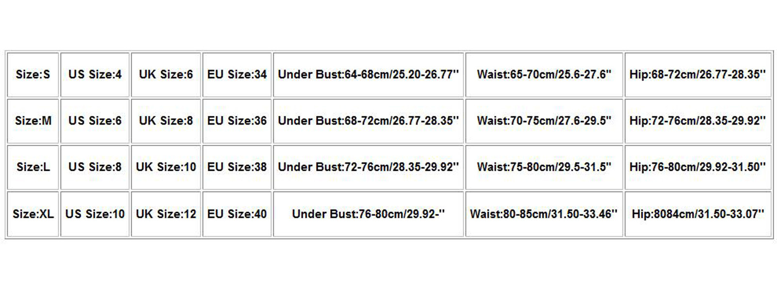 Размер Американский размер Размер Великобритании Европейский размер Под грудью Талия Бедра S 4. 6 34 64-68 см/25,20-26,77 дюйма 65-70 см/25,6-27,6" 68-72 см/26,77-28,35 дюйма М 6 8 36 68-72 см/26,77-28,35 дюйма 70-75 см/27,6-29,5" 72-76 см/28,35-29,92 дюйма L 8 10 38 72-76 см/28,35-29,92 дюйма 75-80 см/29,5-31,5" 76-80 см/29,92-31,50'' Xl 10 12 40 76-80 см/29,92-'' 80-85 см/31,50-33,46'' 8084 см/31,50-33,07''Сделала покупку у данного продавца впервые. Купила на свой страх и риск два комплекта сразу: для мальчика и девочки. Ткань-... Читать отзыв полностью...