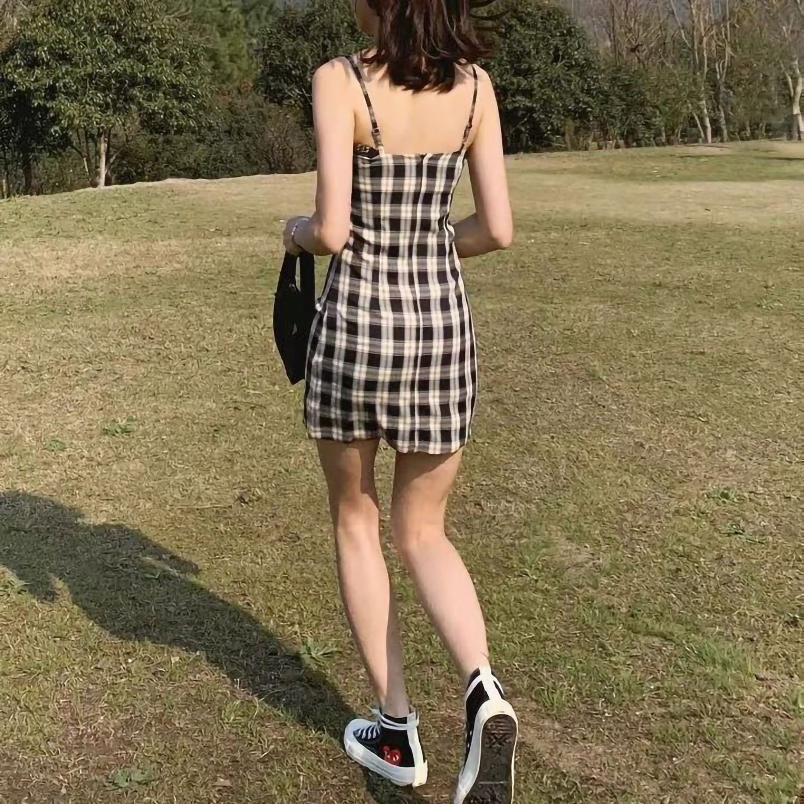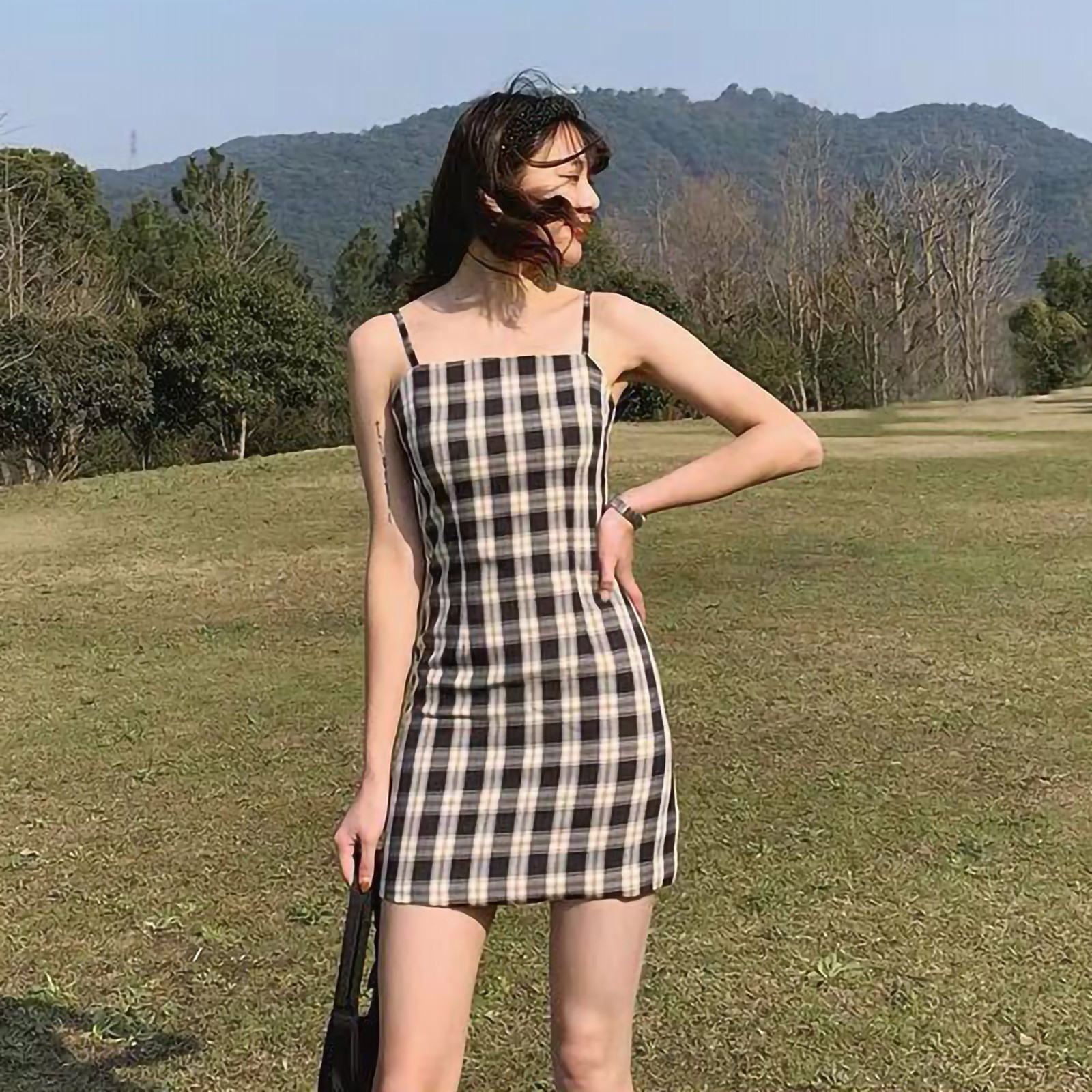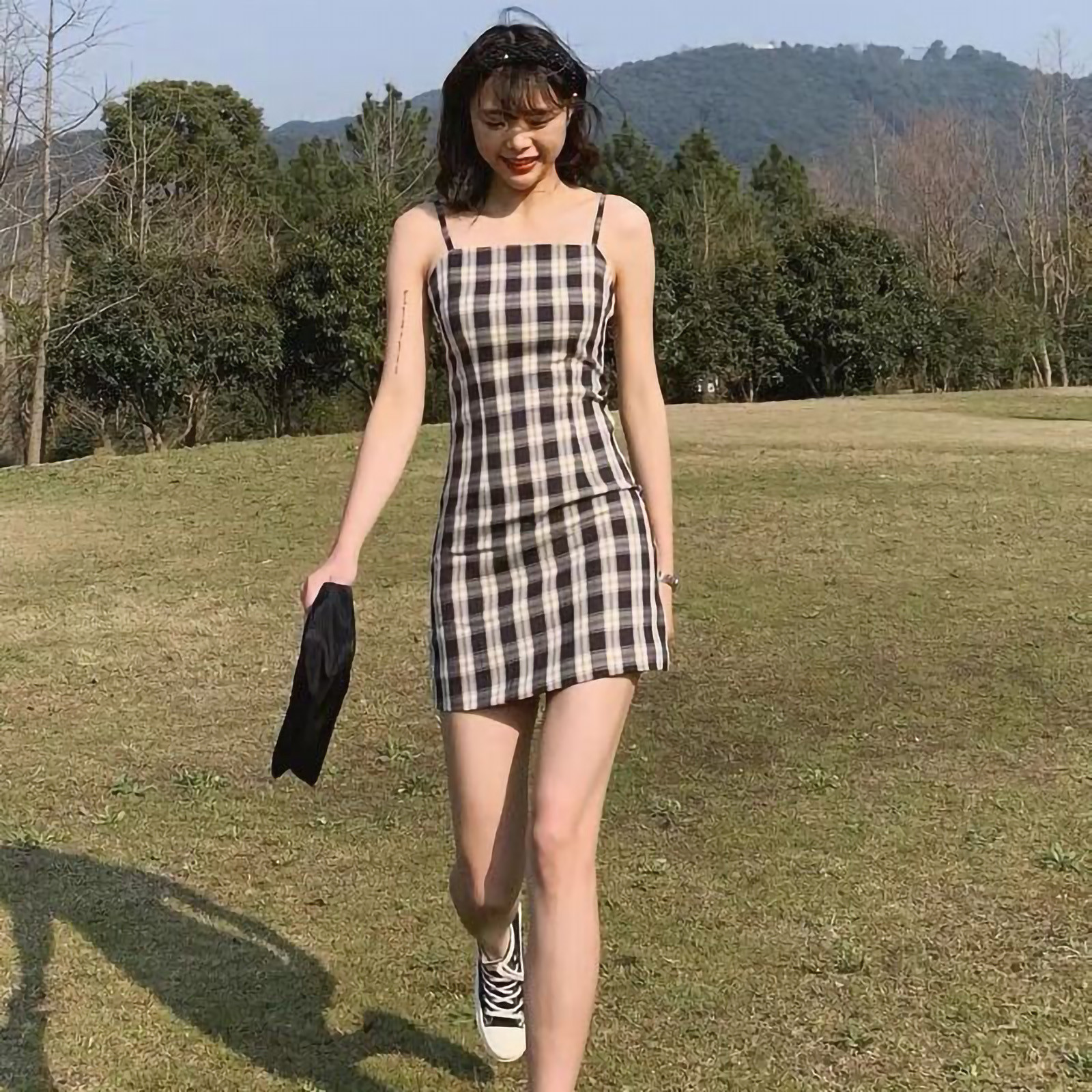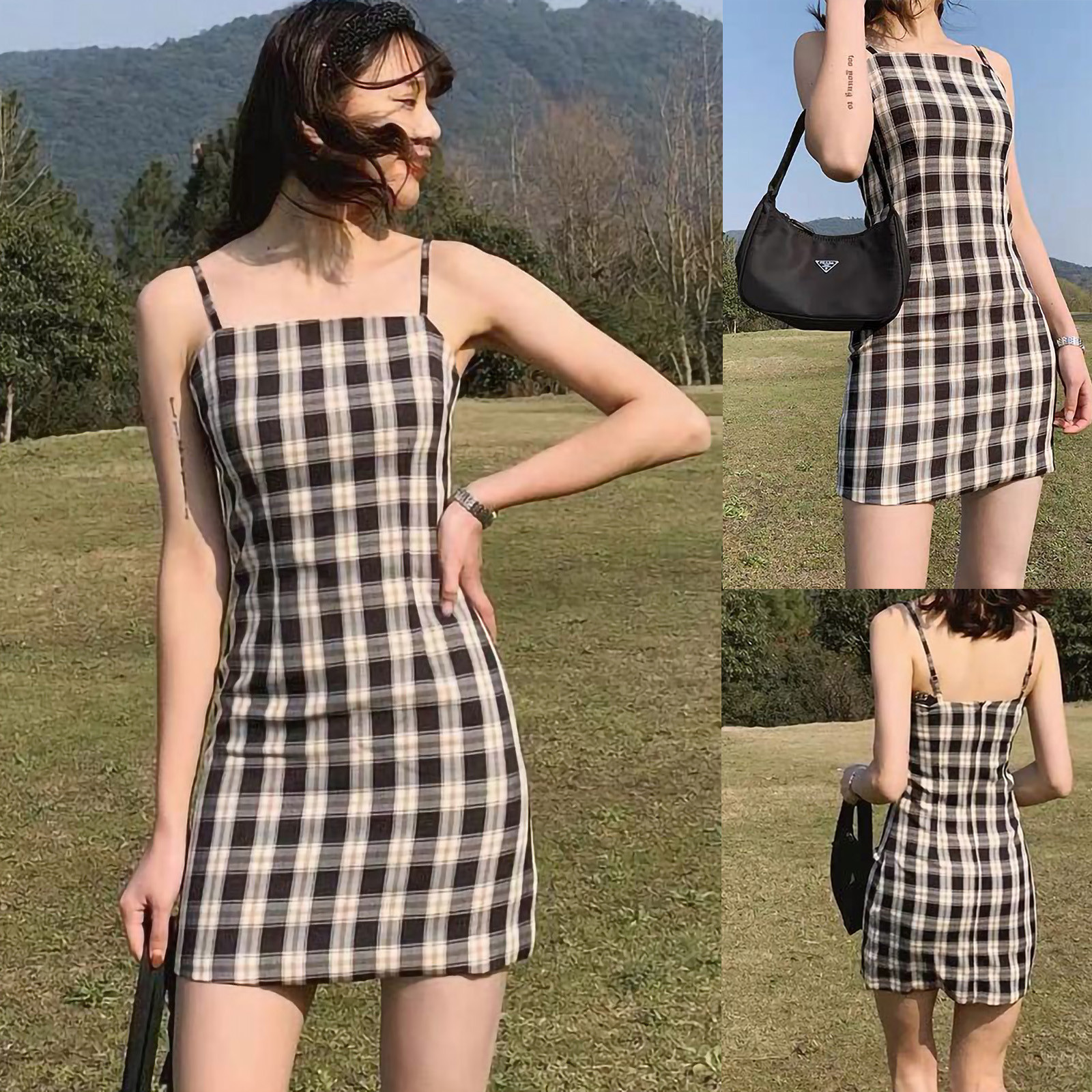 Женское летнее платье, черное клетчатое платье с принтом, без рукавов, лифчик выше колена, женское Короткое облегающее платье, vestido de mujer M *