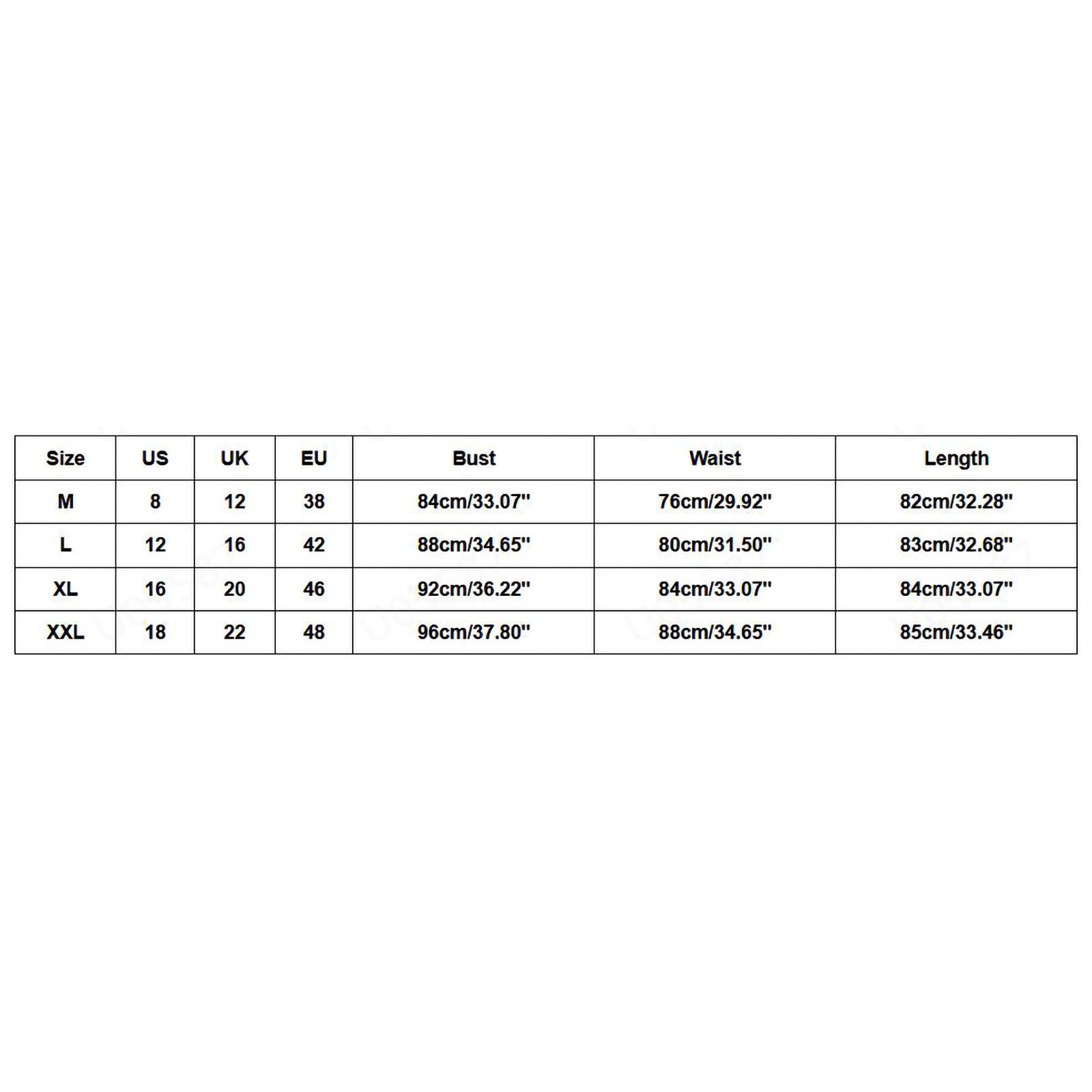 Размер США Великобритания ЕС Бюст Талия Длина М 8 12 38 84 см/33,07'' 76 см/29,92'' 82 см/32,28'' L 12 16 42 88 см/34,65'' 80 см/31,50'' 83 см/32,68'' XL 16 20 46 92 см/36,22'' 84 см/33,07'' 84 см/33,07'' XXL 18 22 48 96 см/37,80'' 88 см/34,65'' 85 см/33,46''От магазина один негатив! Товар не получил! Прошло 9 месяцев! Все споры закрыл сам магазин! Обещал 30 раз повторные поставки... Читать отзыв полностью...