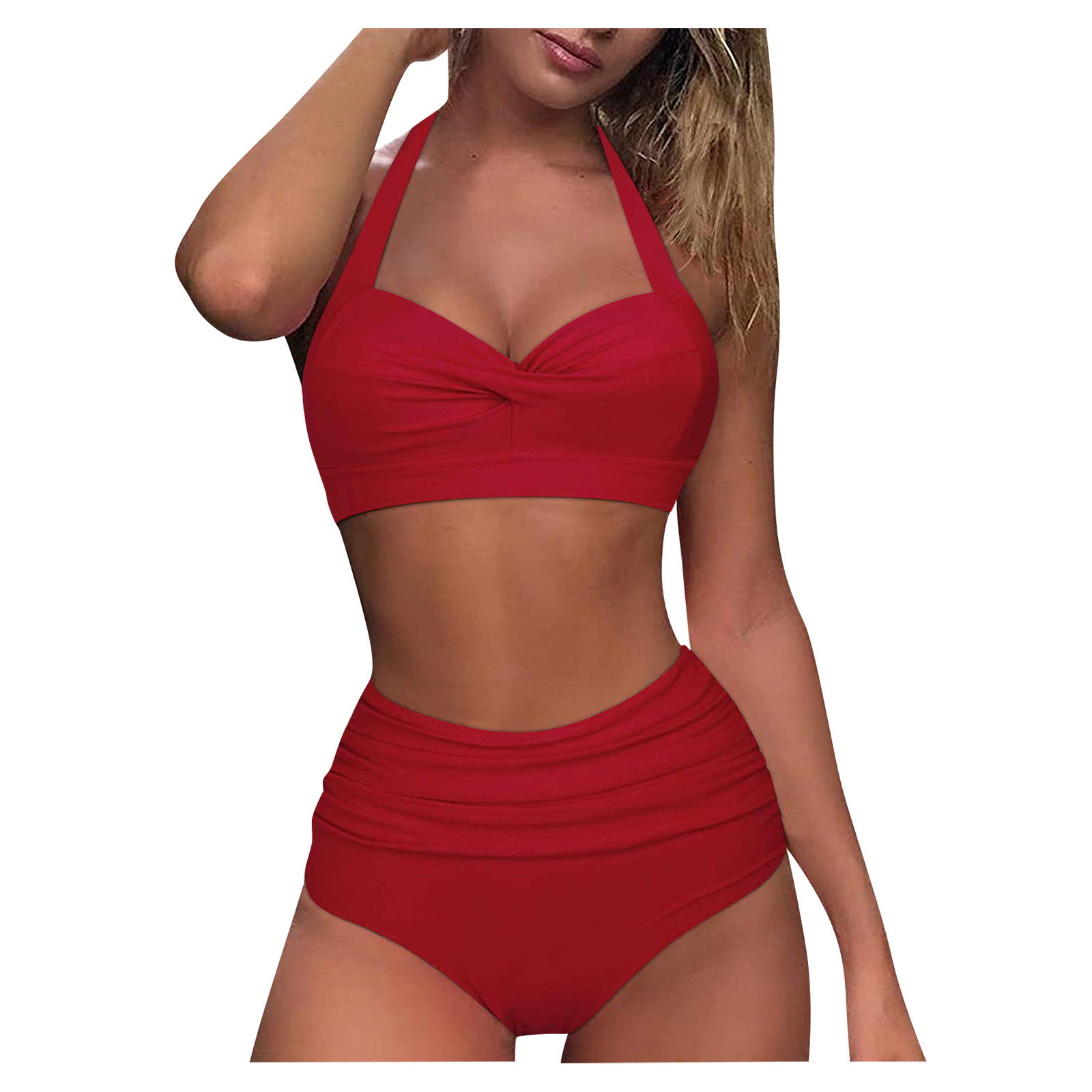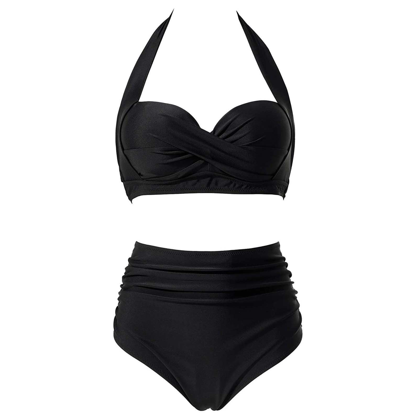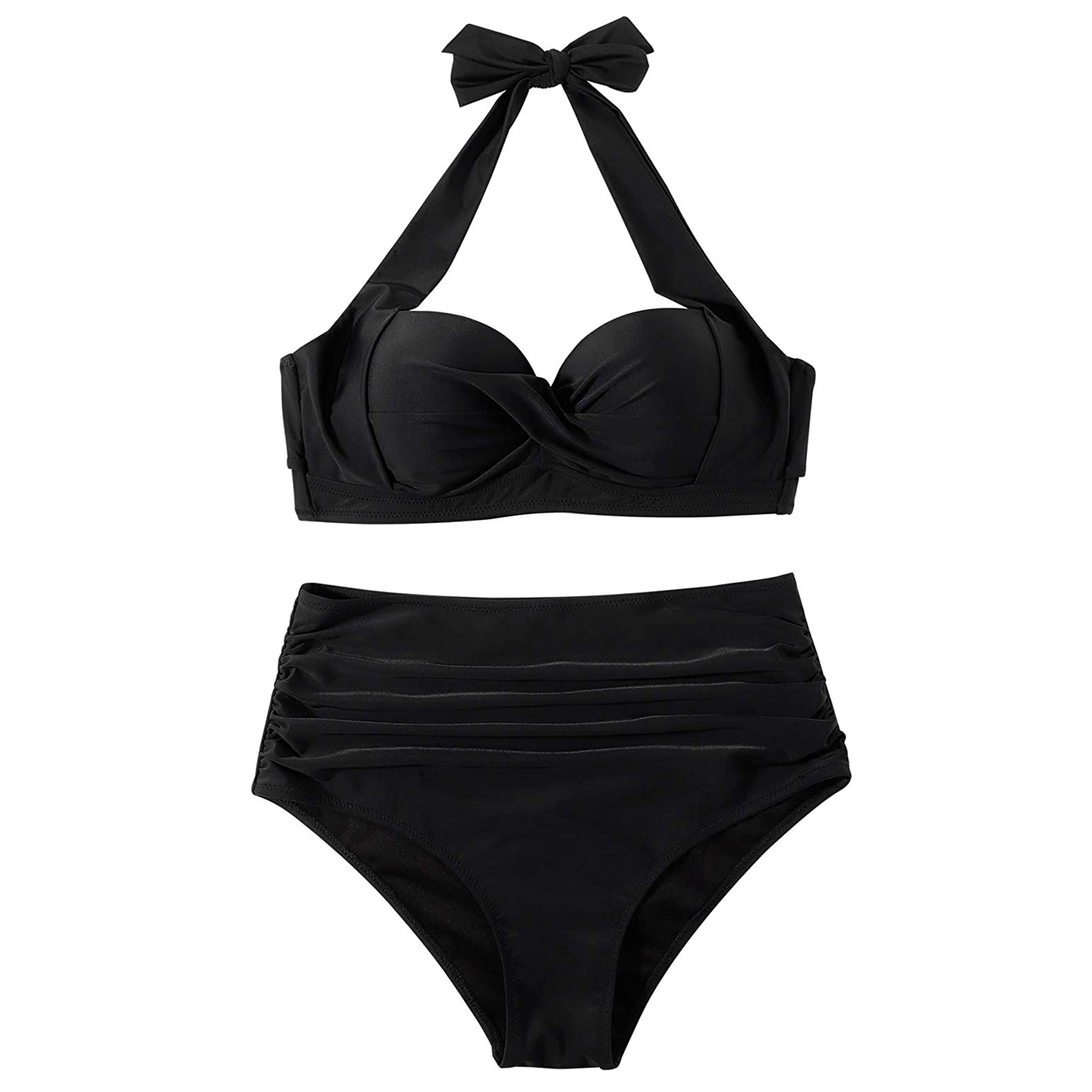 Комплект из двух предметов, женский купальник, винтажный купальник, Ретро стиль, Холтер, с рюшами, высокая талия, с принтом, комплект бикини, купалник, женский