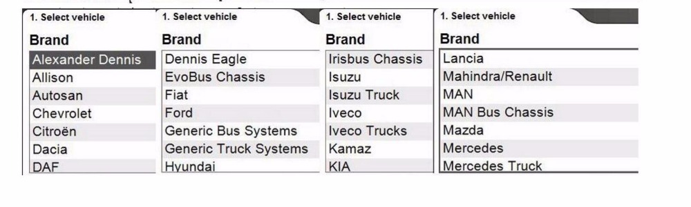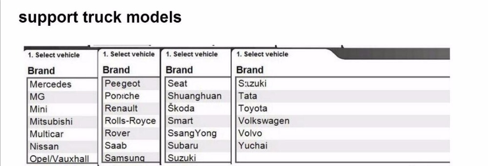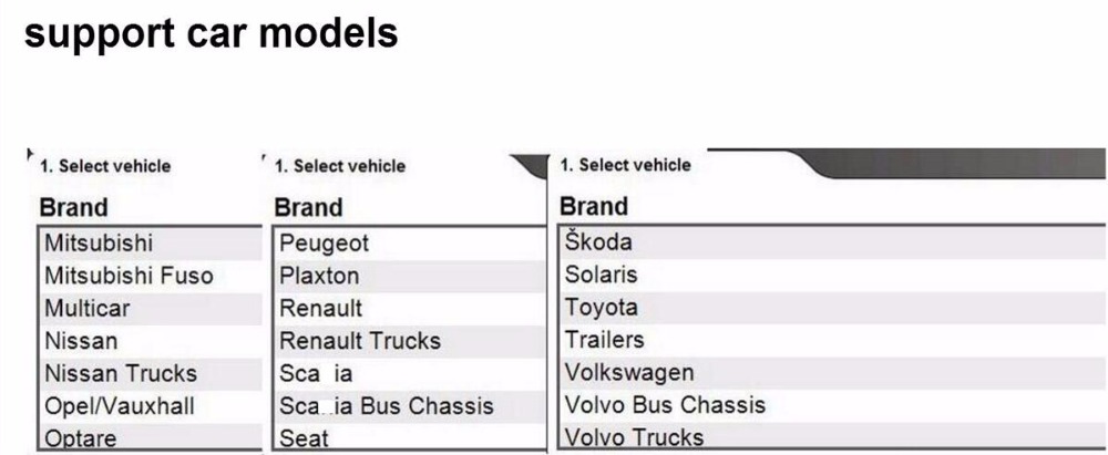 С автомобилями, вы можете выполнить фирменную диагностику автомобилей и светильник vans с 1988 года. В общей сложности 47 различных брендов. Посылка с программным обеспечением для грузовиков позволяет выполнять диагностику бренда на светильник и тяжелые коммерческие транспортные средства, автобусы и трейлеры начиная с 1995 года.