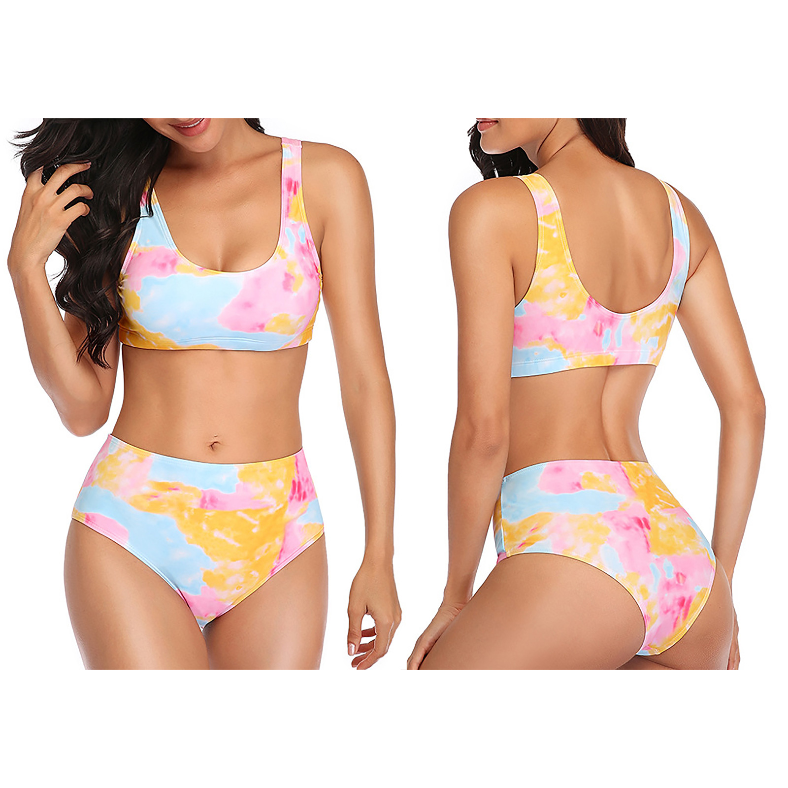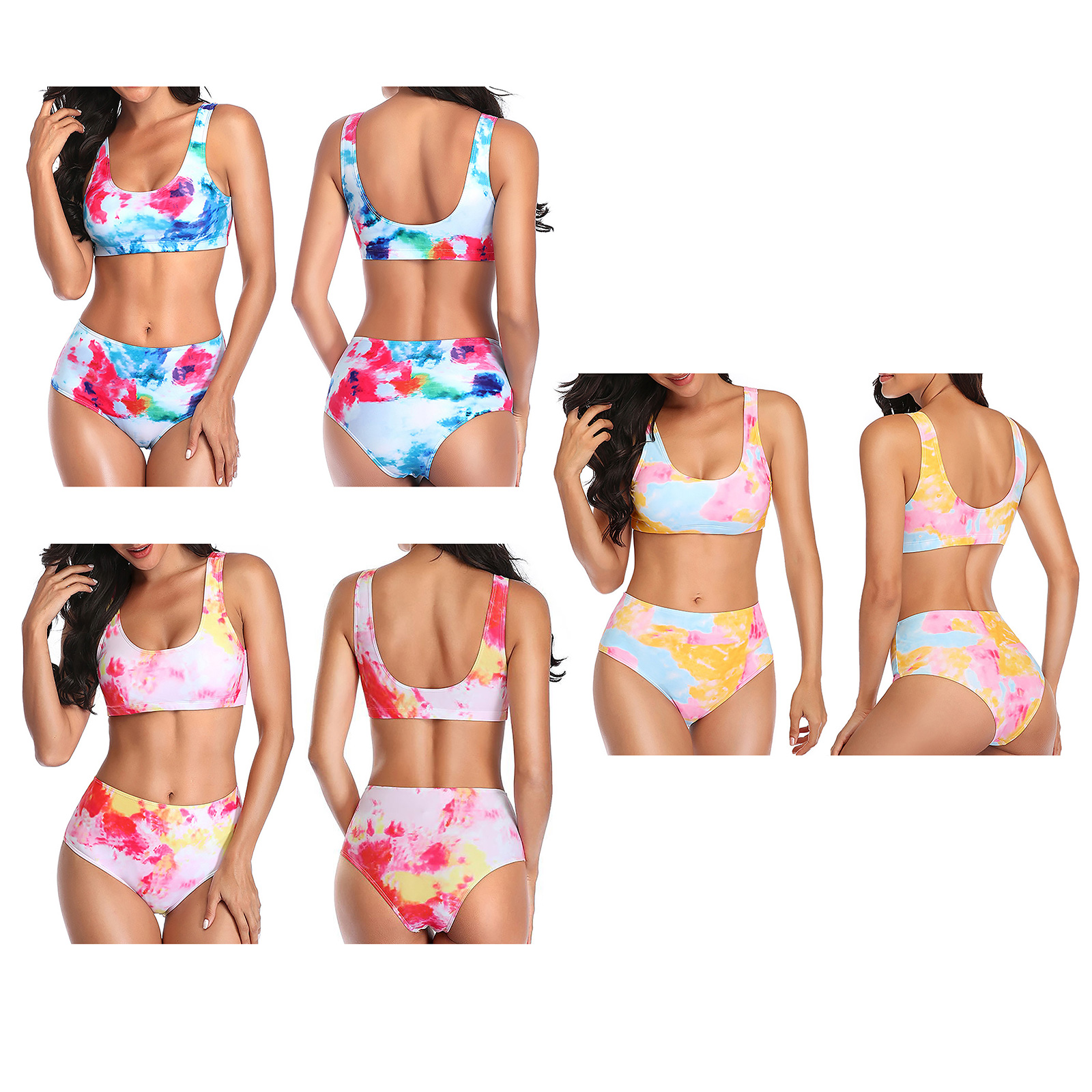 Women Tie Dye Print Deep U Neck Shoulder Straps Removable Pads Top Wide Elastic Waistband Briefs.
