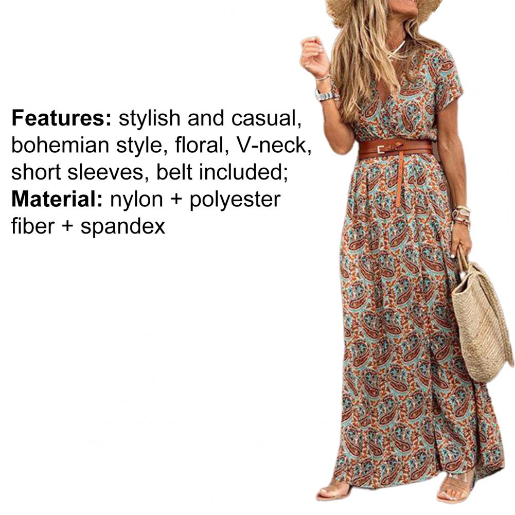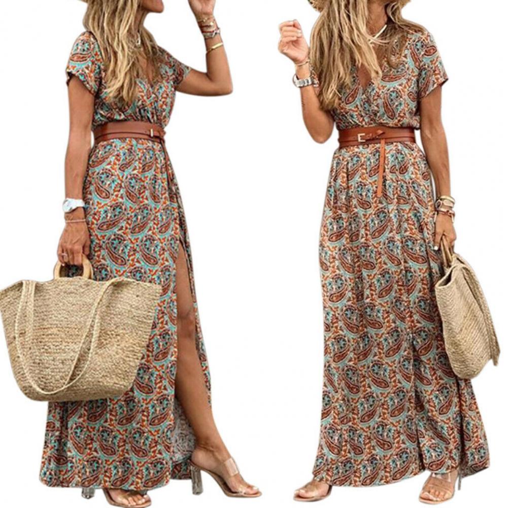 Новинка 2021, женское длинное пляжное платье в стиле бохо с v-образным вырезом, коротким рукавом и принтом пейсли, летнее пляжное платье с поясом