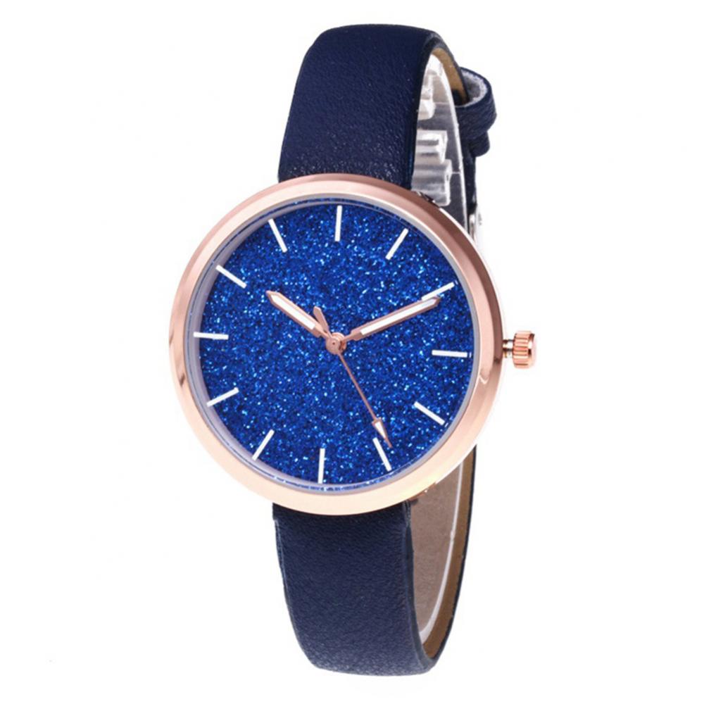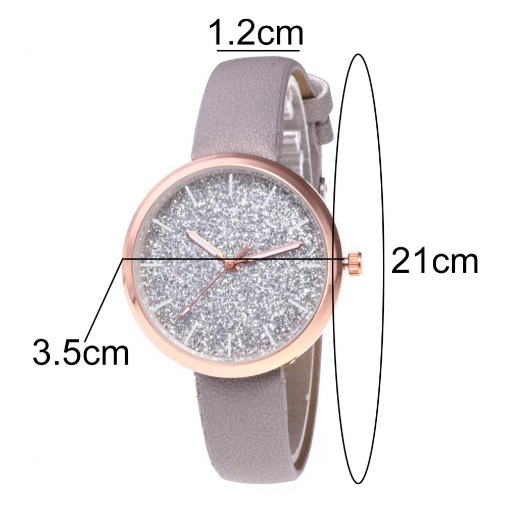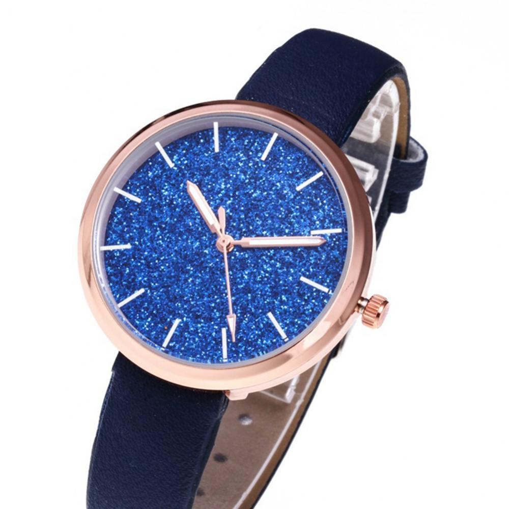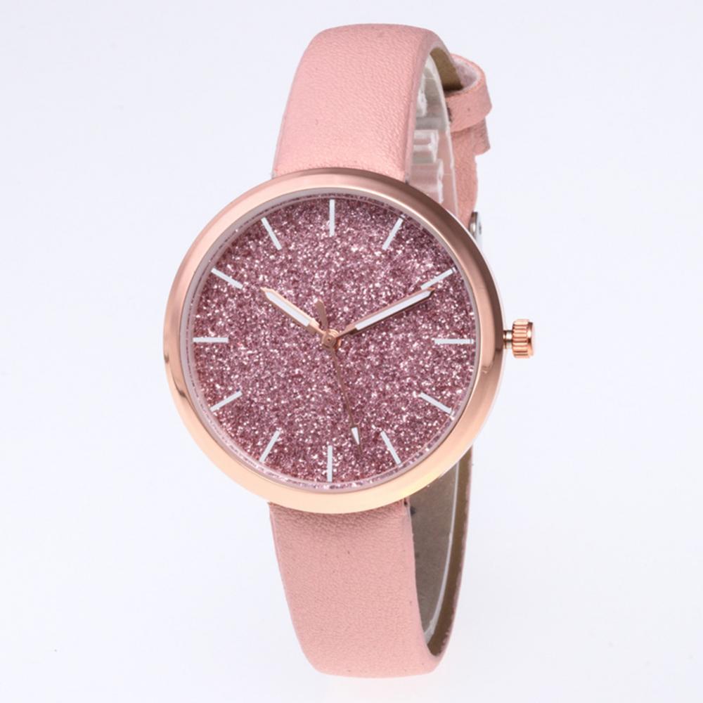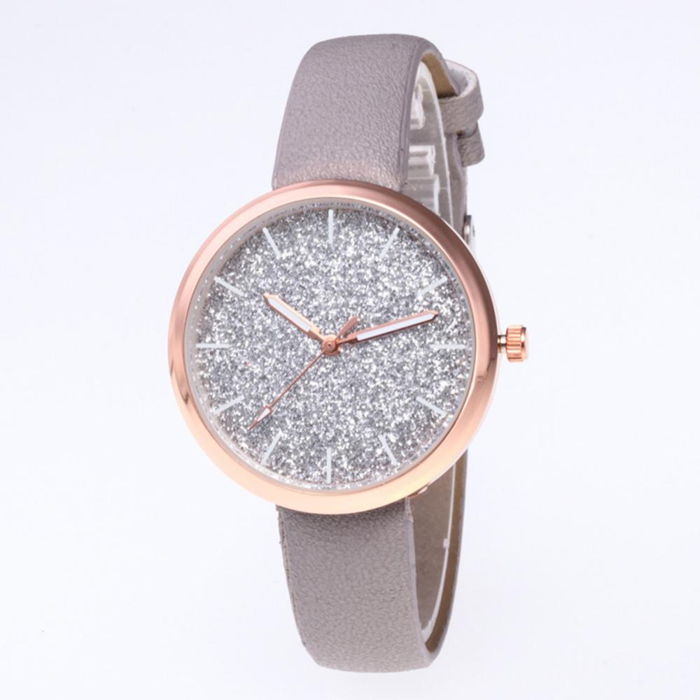 Классический круглый циферблат и дизайн без цифр с декором из блестящих частиц скраба, простой, но стильный.