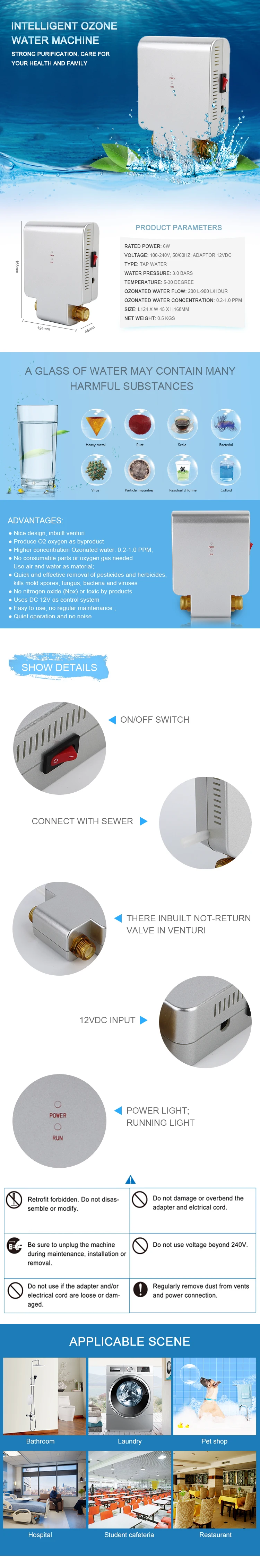 Вода с высокой концентрацией озона может стерилизовать продукты питания и кухонные изделия, дезинфицировать руки, полы, стены, столы; Использовать в качестве чистящего раствора для полотенец и тряпок. Окисляет, разлагает бактерии и пестициды от фруктов и овощей, сохраняет еду свежей, нейтрализует Гормоны и запах мяса, продлевает срок годности и обеспечивает безопасность пищевых продуктов; Может также удалять микробы, бактерии и остаточный хлор в водопроводной воде.