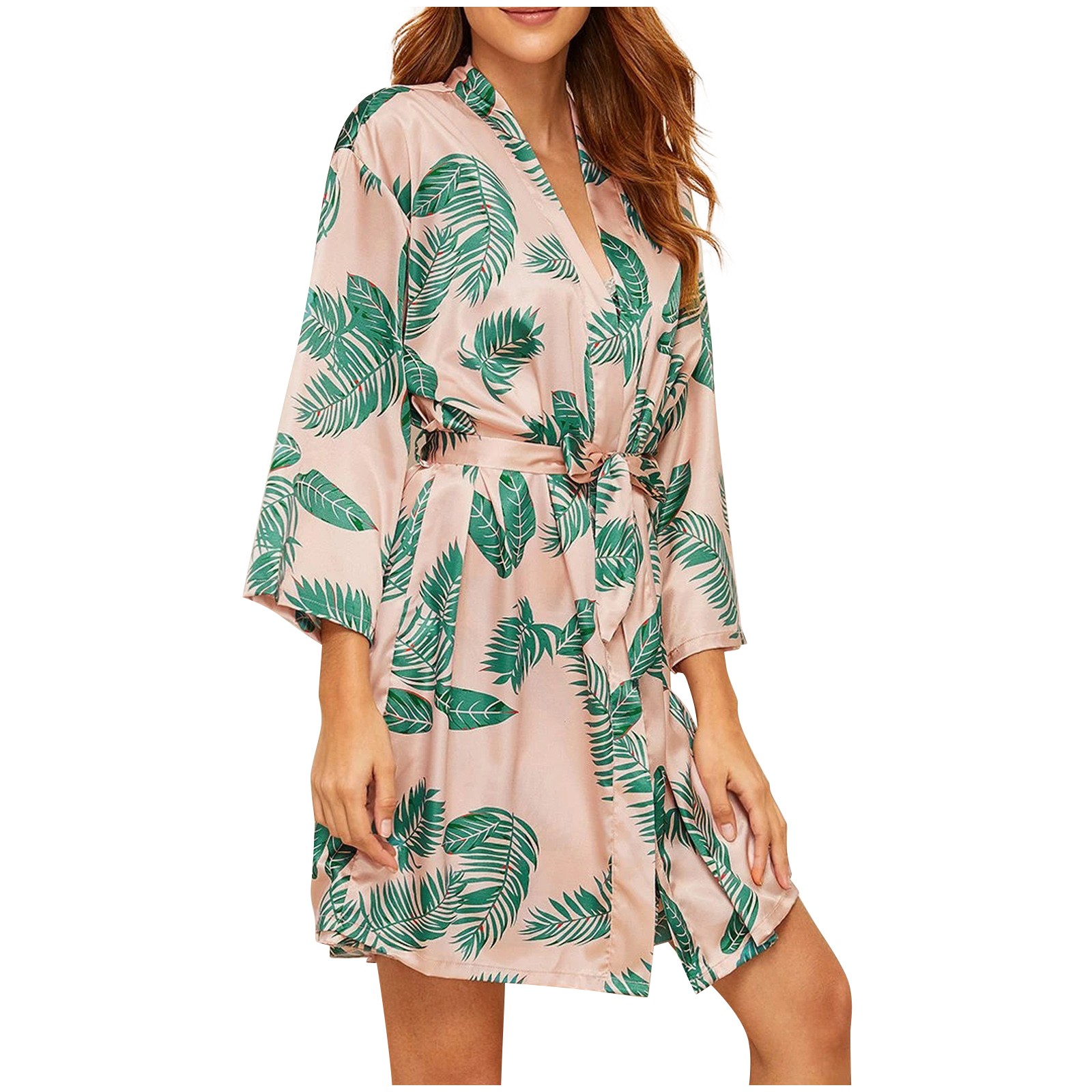 Женские халаты на весну и осень атласные шелковые пижамы женские халаты одежда для сна с принтом зеленых листьев халаты размер M *