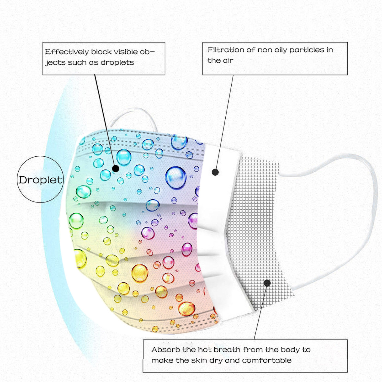 В 3 слоя Нетканая одноразовая маска изготовлена из 3 слоев нетканого материала, Безопасен и безопасен для использования. Дышащий материал и милый Узоры, которые делают его полезным и модным. Специальный 3 слоя из нетканого материала Дизайн, обеспечивает некоторую защиту от пыли, автомобильных выхлопных газов, Пыльца и т. д. эластичная Ушная петля, легко носить и не давит на уши. Маникюрный салон или любые другие области, где может потребоваться защита