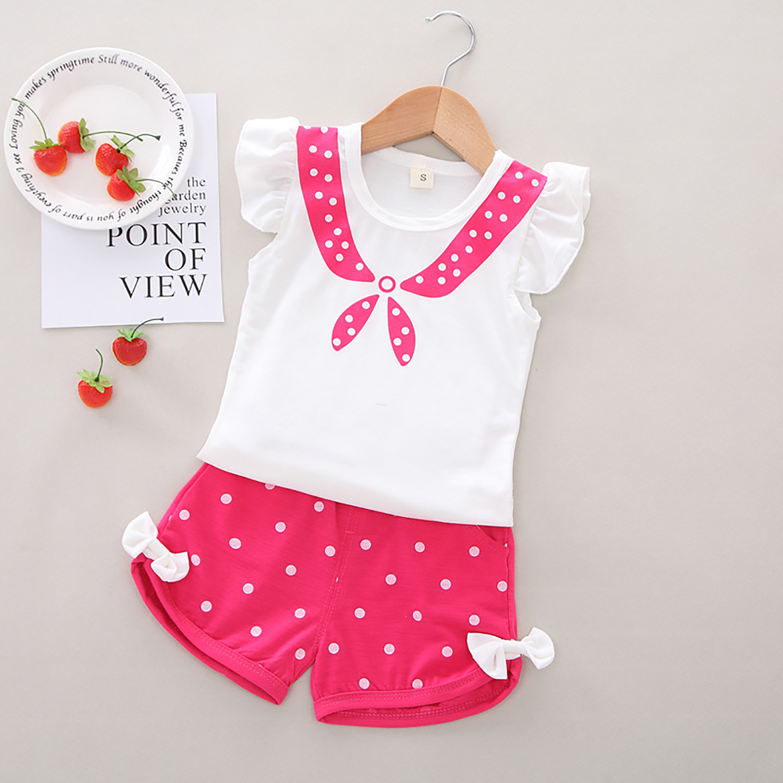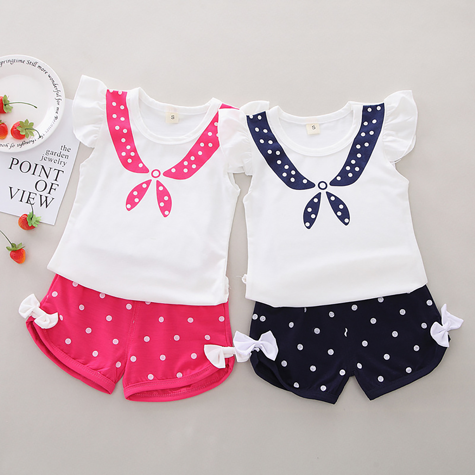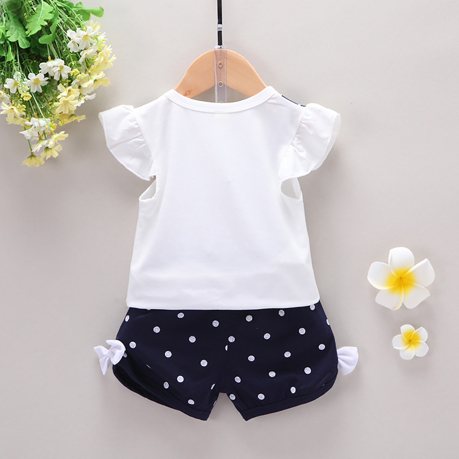 Комплект летней одежды для маленьких девочек; Топ с оборками и рукавами-крылышками, круглым вырезом и милым принтом с героями мультфильмов; Комплект с шортами в горошек.