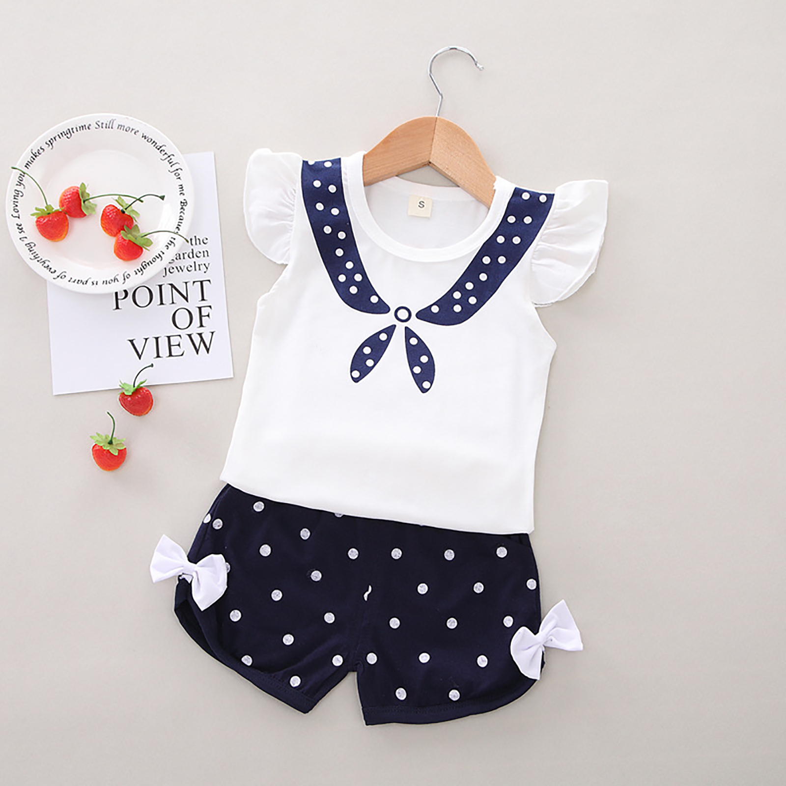 Обычный круглый вырез, красивые рукава с рюшами, милый Принт моряка в топе, в комплекте с эластичным поясом и шортами с принтом в горошек.