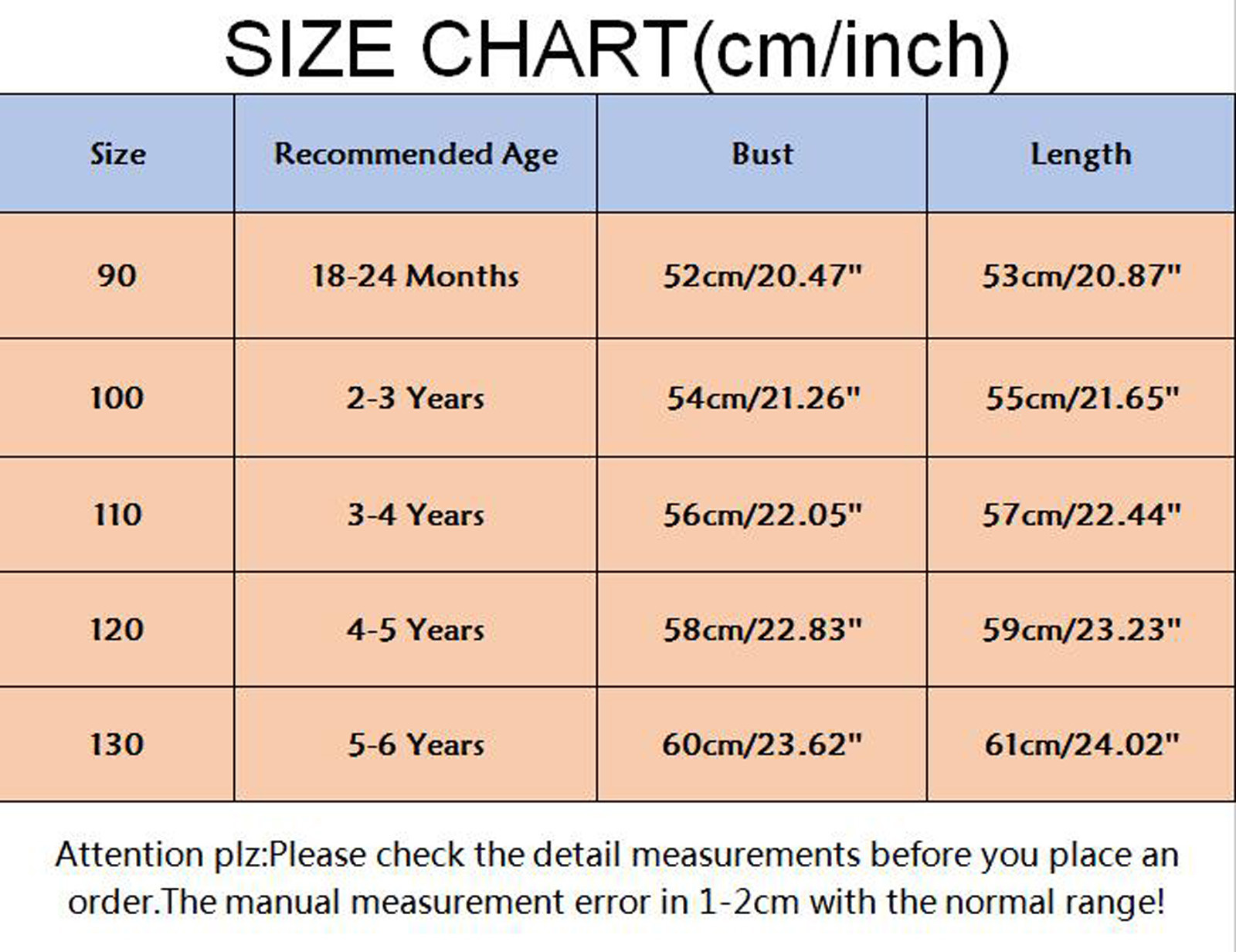 Размер Рекомендуемый возраст Бюст Длина 90 18-24 месяцев 52 см/20,47'' 53 см/20,87'' 100 От 2 до 3 лет 54 см/21,26'' 55 см/21,65'' 110 От 3 до 4 лет 56 см/22,05'' 57 см/22,44'' 120 От 4 до 5 лет 58 см/22,83'' 59 см/23,23'' 130 От 5 до 6 лет 60 см/23,62'' 61 см/24,02''