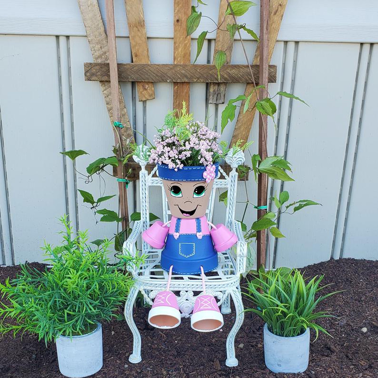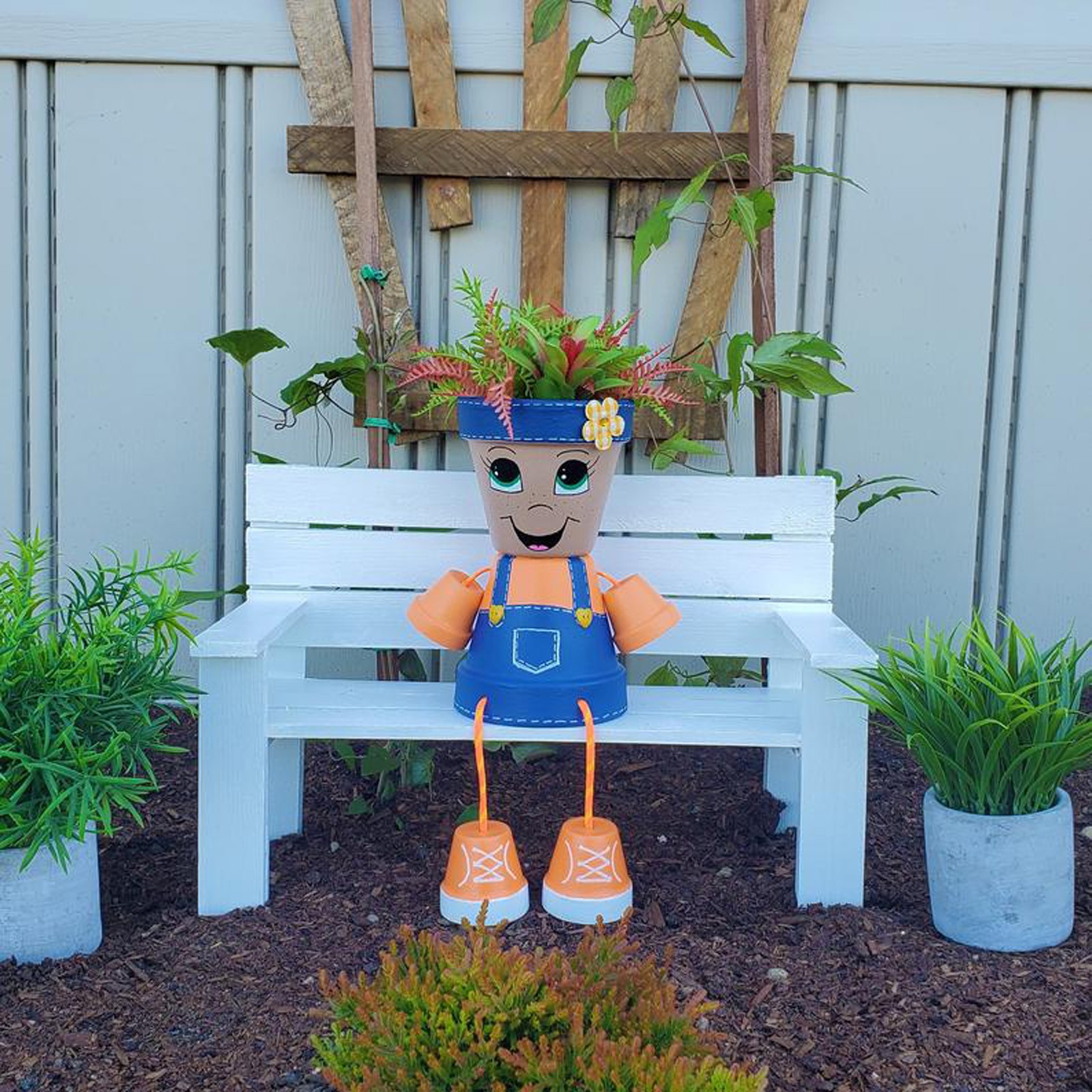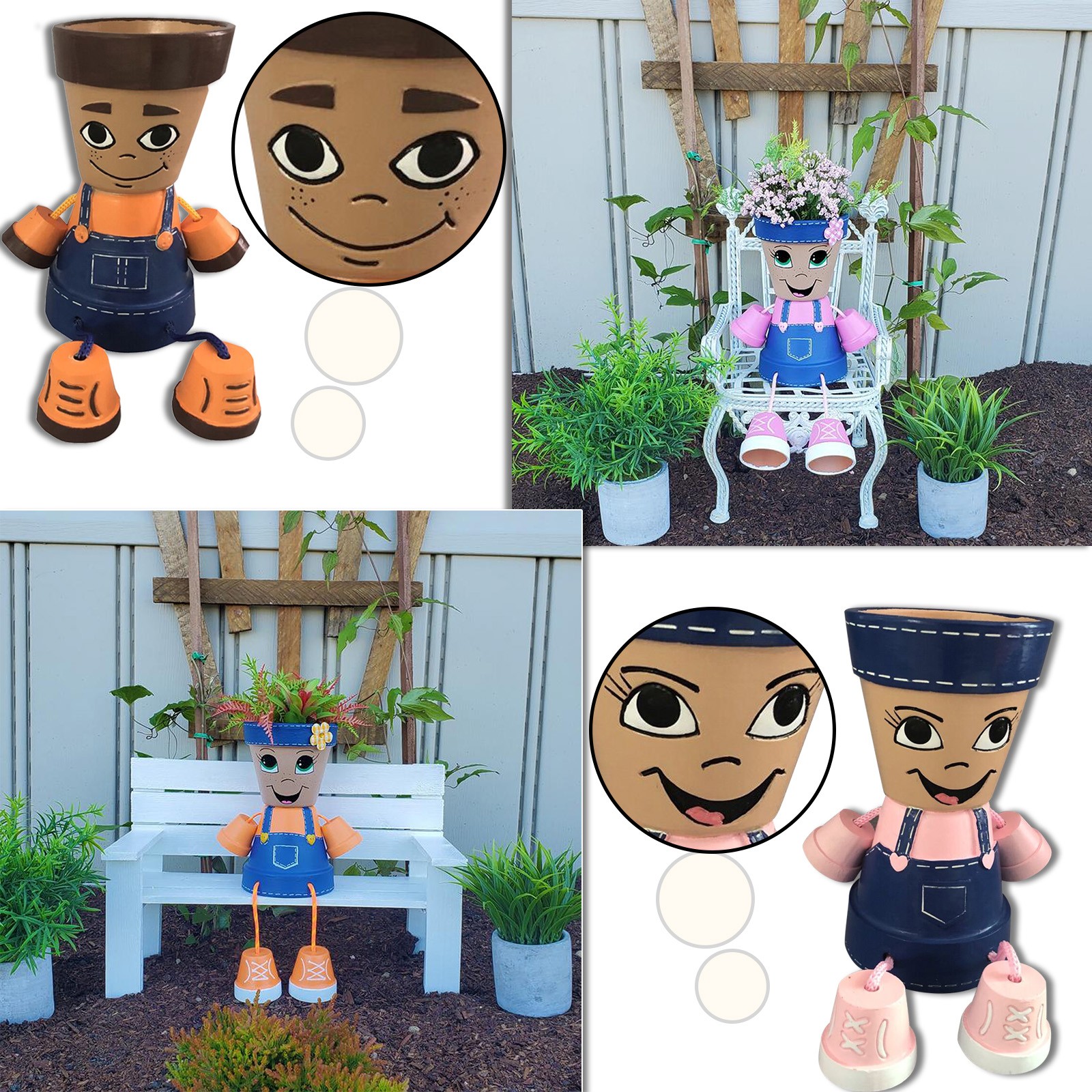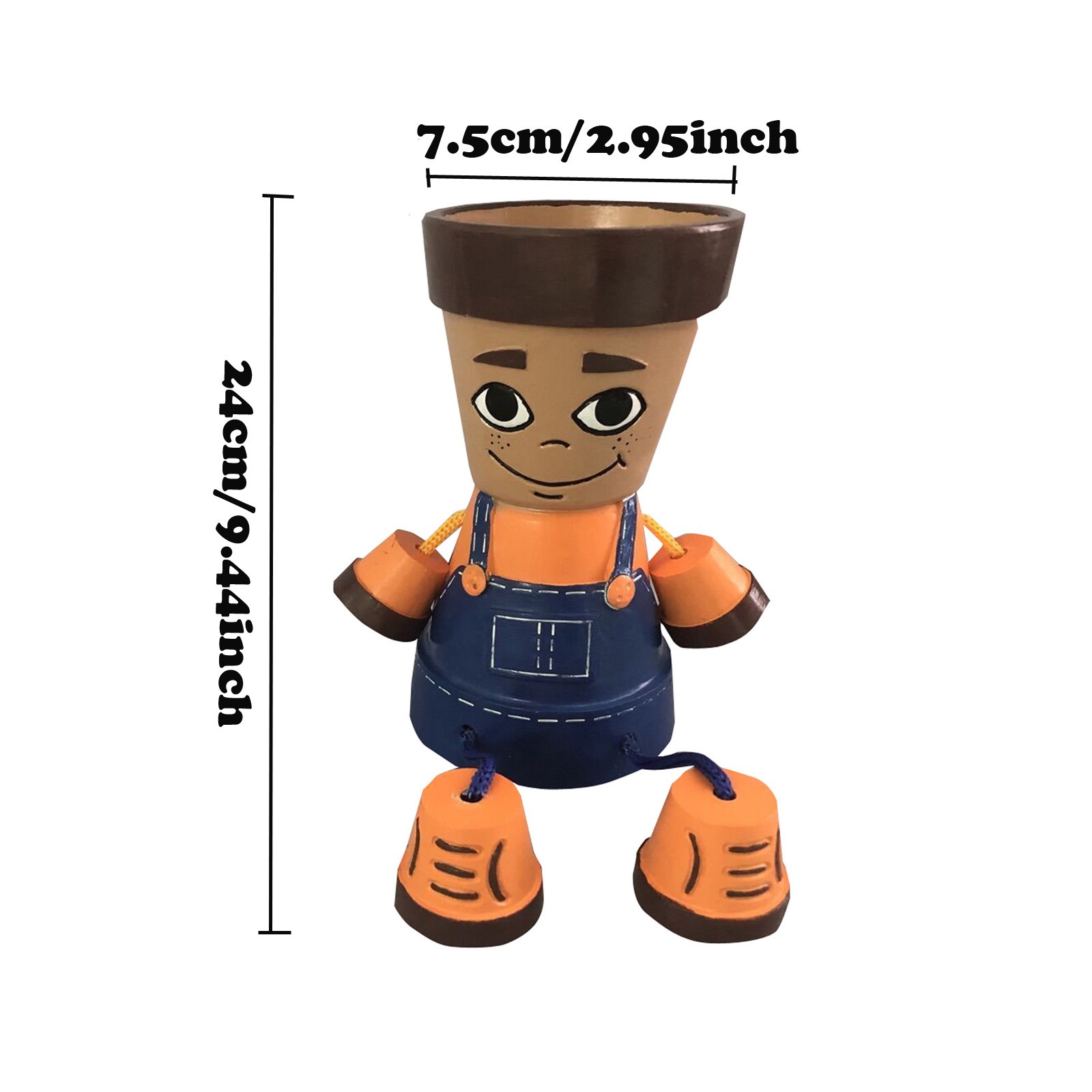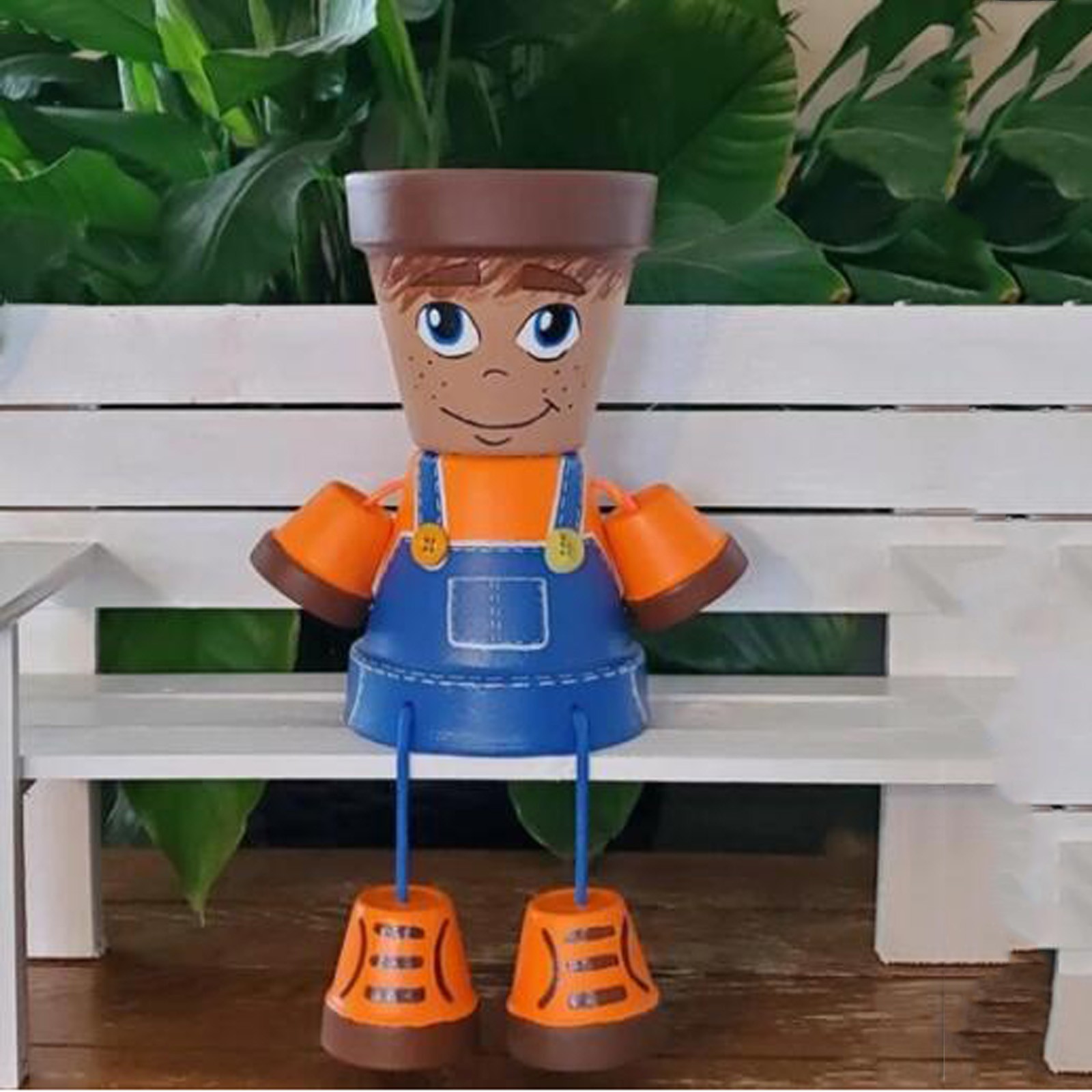 Эти сельские детские горшки добавляют немного удовольствия вашему саду, террасе или интерьеру. В них есть яркая рубашка с синими джинсовыми комбинезонами и кроссовками. Добавьте ваши любимые растения или цветы (не входят в комплект) в горшок и придайте себе особенные волосы! Ноги можно спрятать под телом, поэтому их также можно легко разместить на столе. Они ручной работы с использованием терракотовых Горшков и распыляются акриловой краской и напольным полуглянцевым акриловым герметиком. Также возможно отсутствие раковины для ног.