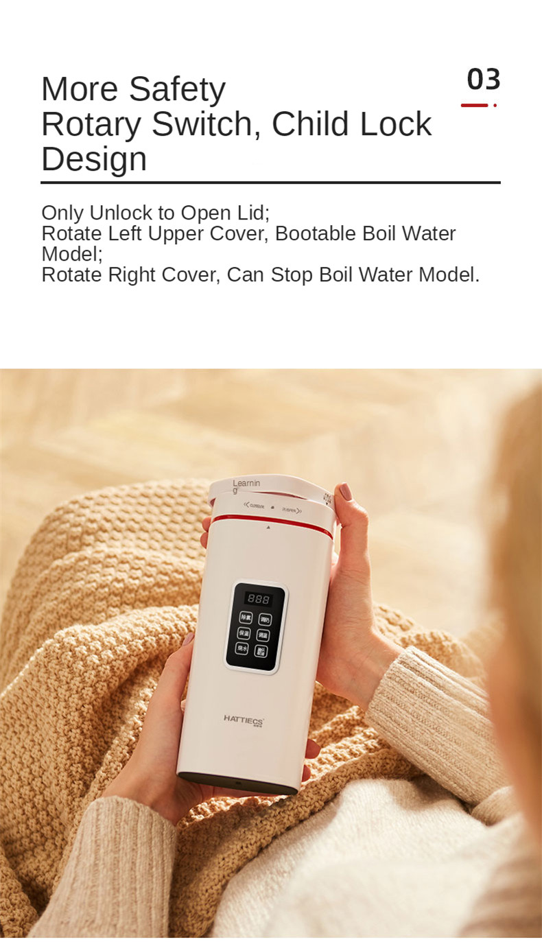 ● Поворотный переключатель, конструкция замка ребенка, поверните крышку влево, чтобы активировать режим кипения воды; Поверните крышку вправо, чтобы остановить режим кипения, Разблокируйте, чтобы открыть крышку. Не только герметичный, но и более безопасный;