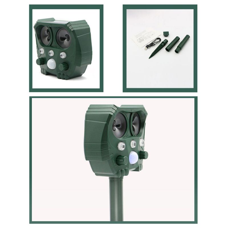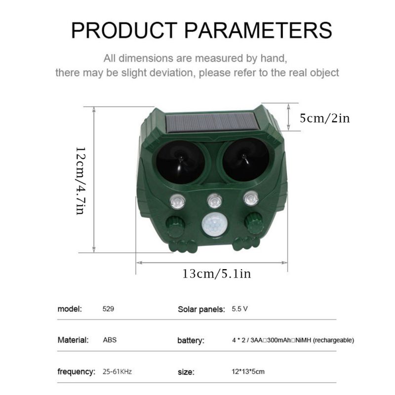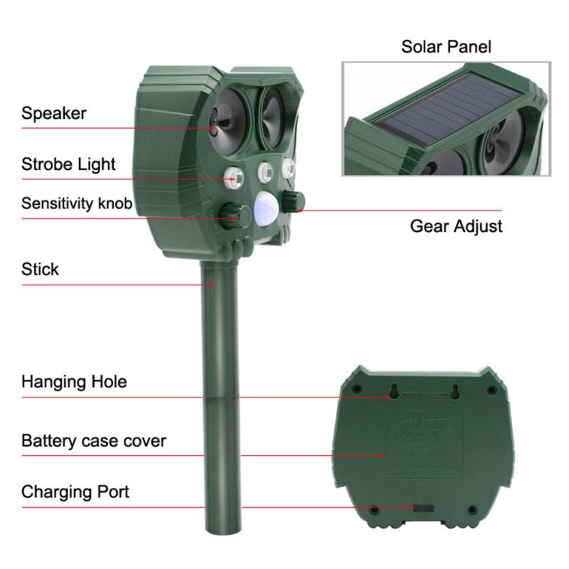 2. Так как отпугиватель животных-это портативный дизайн, он может быть установлен в вашем доме, саду, во дворе, на ферме или в любом месте, поэтому этот продукт является низковольтным источником питания с батареями, этот продукт может управлять животными без каких-либо химических гарантий, только излучает ультразвуковые волны 25-61 кГц, чтобы выгнать их. Не причиняет вреда человеческому телу.