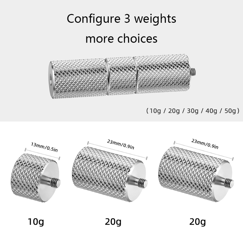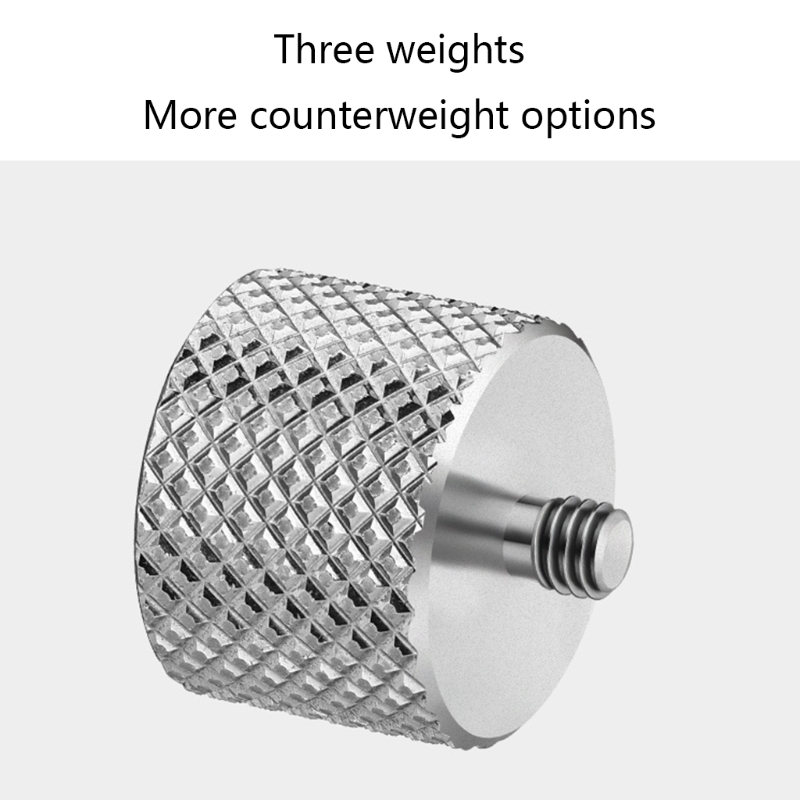 Противовес поддерживает внешнее оборудование, которое может быть сбалансировано, например, широкоугольный объектив, телеобъектив и т. д. и весит менее 70 г.
