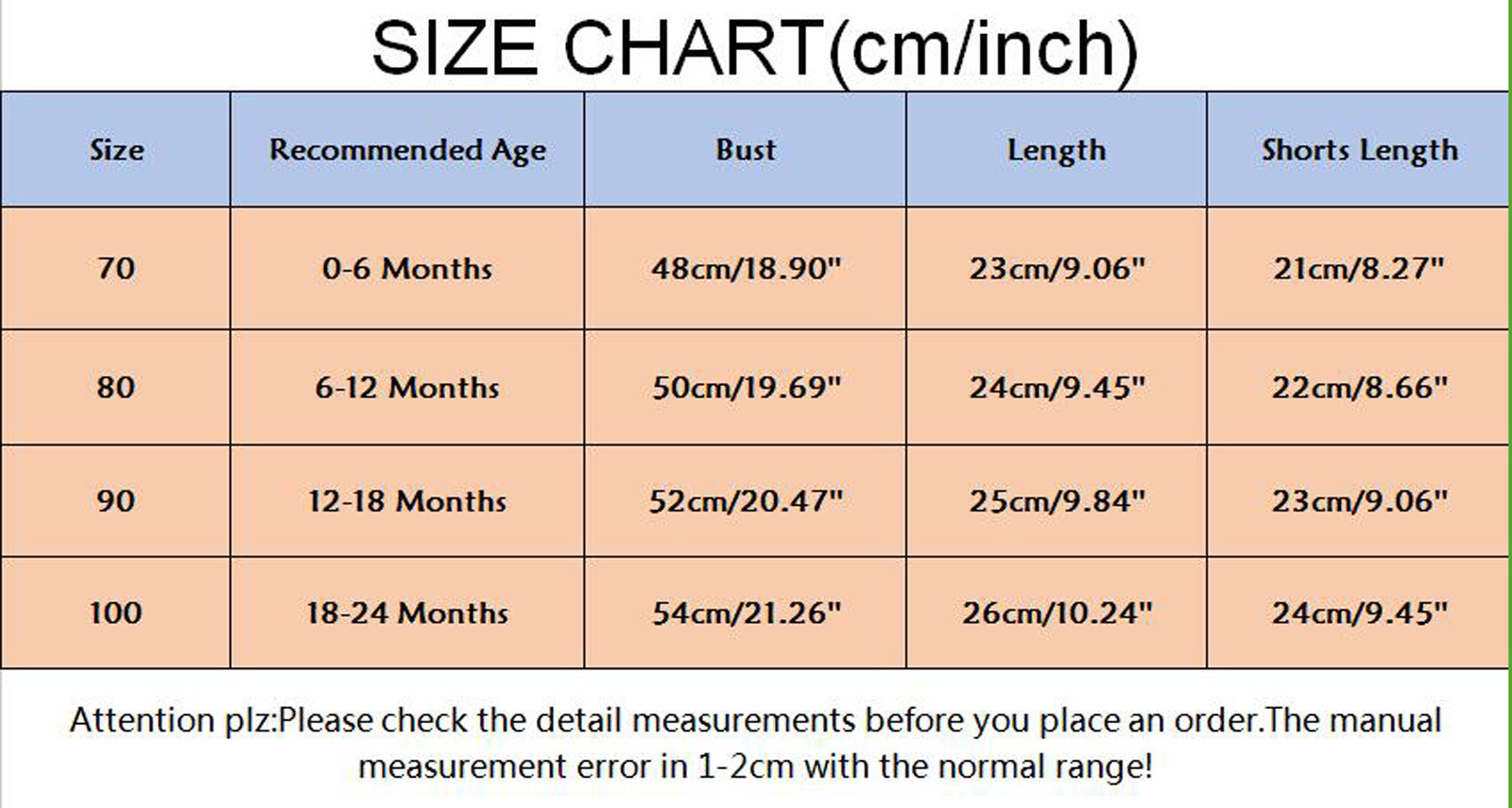 Размеры Рекомендуемый возраст Бюст Длина Длина шорт 70 0-6 месяцев 48 см/18,90'' 23 см/9,06'' 21 см/8,27'' 80 6-12 месяцев 50 см/19,69'' 24 см/9,45'' 22 см/8,66'' 90 12-18 месяцев 52 см/20,47'' 25 см/9,84'' 23 см/9,06'' 100 18-24 месяцев 54 см/21,26'' 26 см/10,24'' 24 см/9,45''