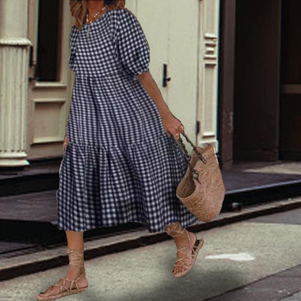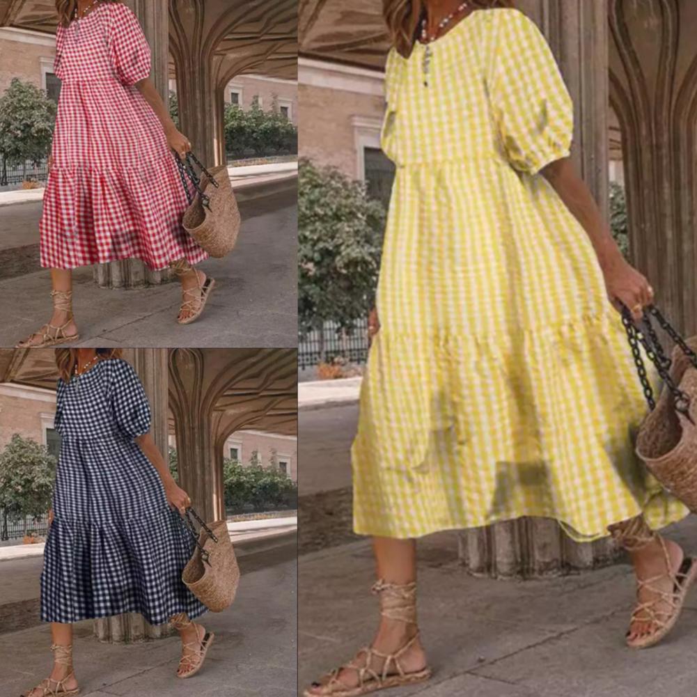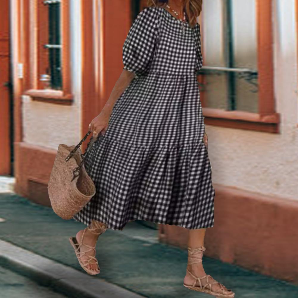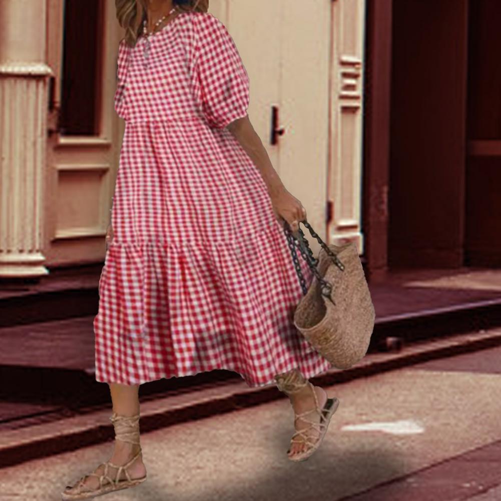 Женское платье, клетчатая Лоскутная летняя юбка с пышными рукавами и круглым вырезом для пляжа