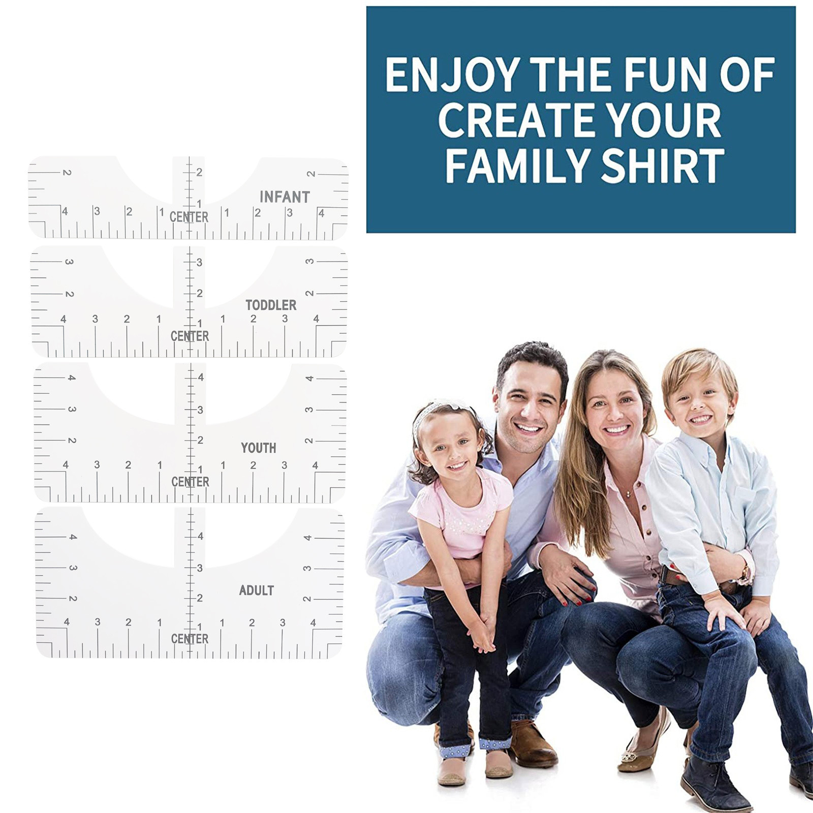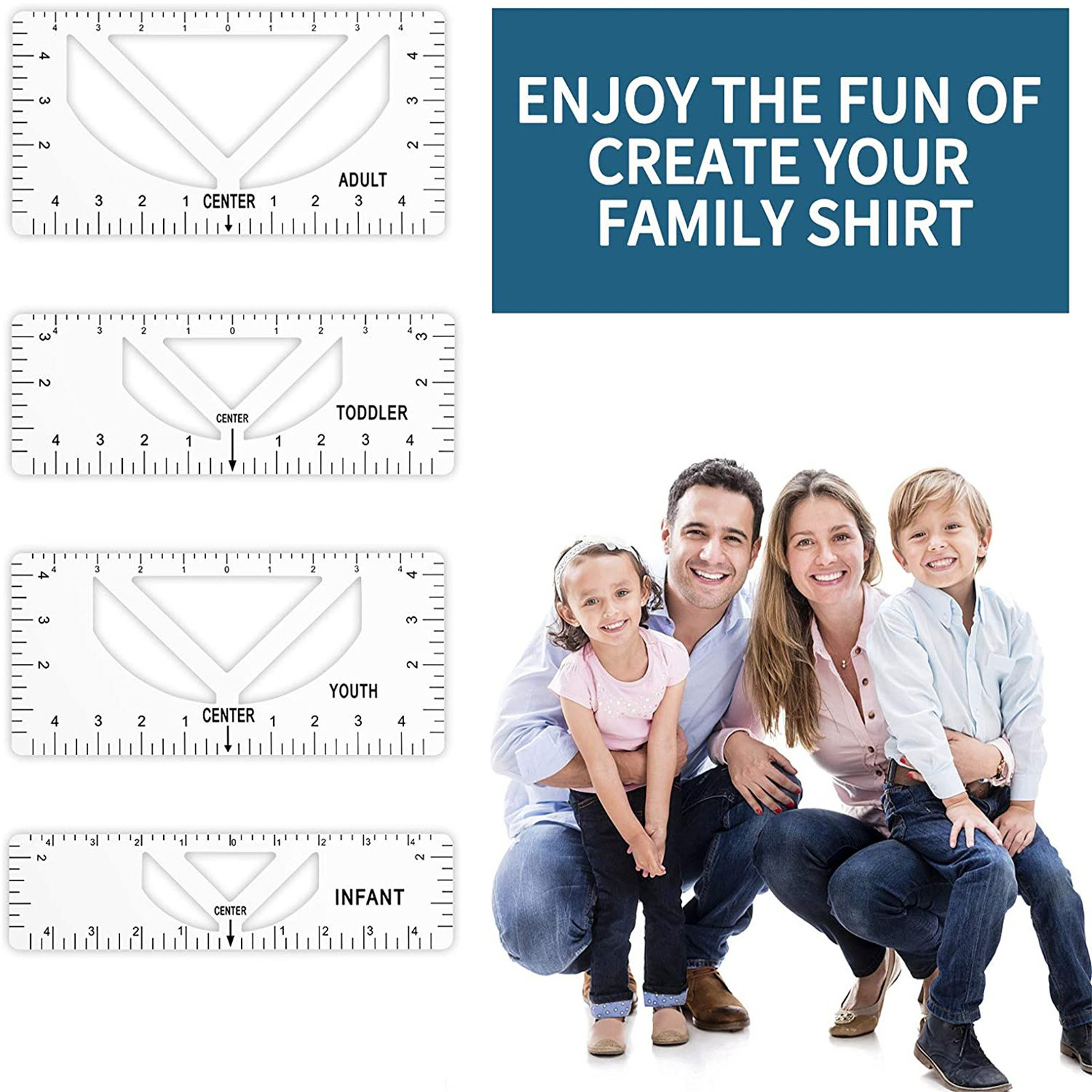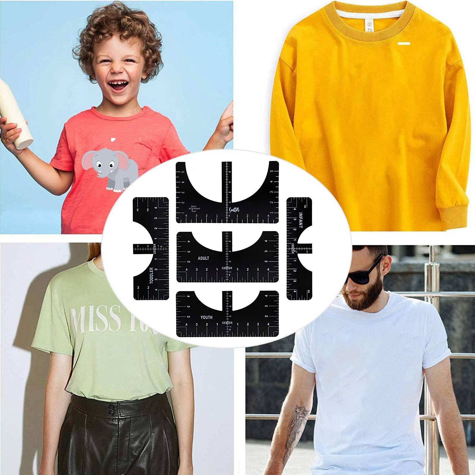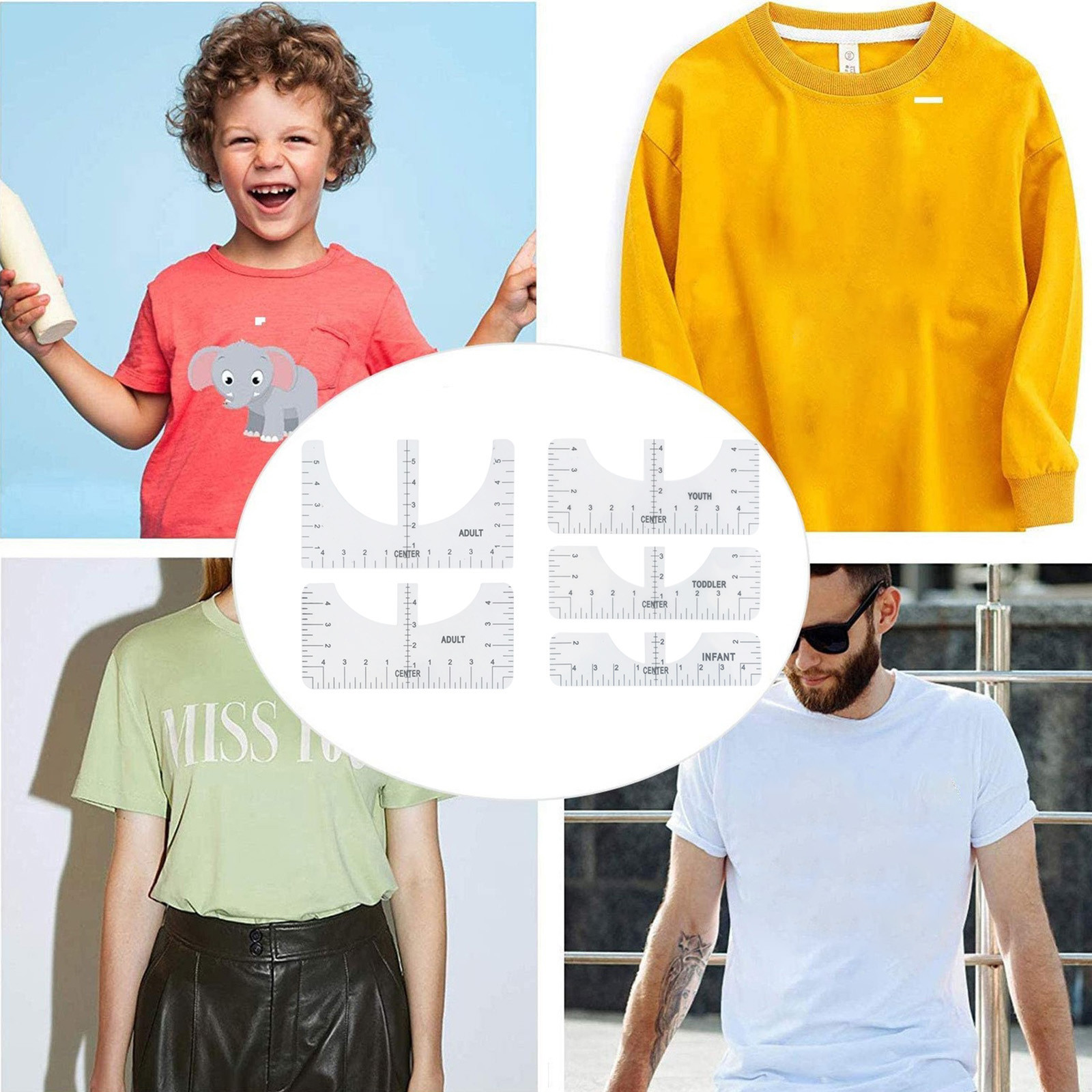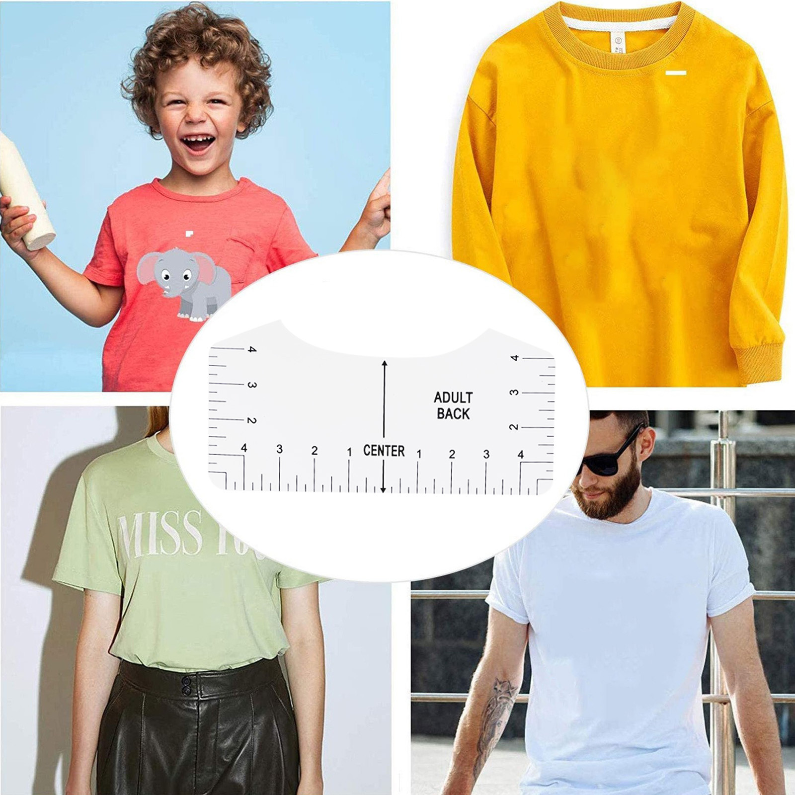 What you can get: Four sizes of sewing rulers, including adults, young children and babies, can meet the clothing needs of the whole family. It is a great craft tool to make your design and measurement more accurate and comprehensive. Easy to use: T-shirt ruler is easy to use. Just align the ruler with the collar of the T-shirt and center the design before embossing. This applies to anyone in the T-shirt business. Help you align left, center or right, and save the time of designing the center. High quality: The middle ruler is made of high-quality PVC, so there is no need to worry about the pvc ruler broken! Can be twisted at will, can be reused DIY T-shirt design: T-shirt alignment tool will help align the design with the shirt and help to align the print perfectly every time! Never worry about things not being centered anymore!High satisfaction: 100% satisfied-if you are not satisfied with our sewing ruler for any reason, please feel free to contact us. We will take full responsibility and responsibility for the quality of our products, and do our best to solve your problems quickly and efficiently!